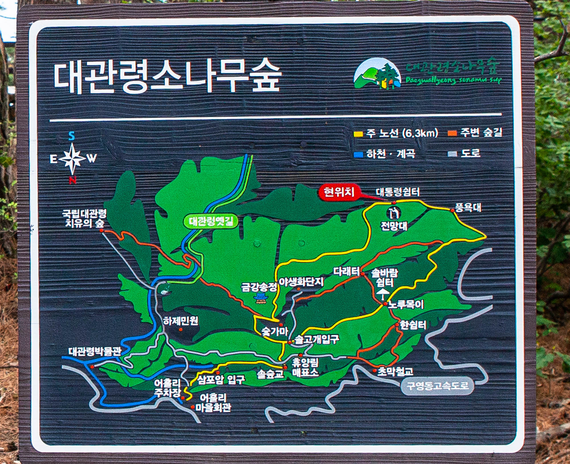 대관령 소나무 숲길의 들머리는 어흘리 주차장에서 부터 시작합니다. 세개의 폭포가 있는 삼포암 계곡을 따라 솔숲교-노루목이-생강나무군락지-풍욕대-대통령쉼터-야생화단지-금강송정-숯가마-솔고개입구를 지나 원점회귀하는 6.3km의 2시간30분 코스 입니다.