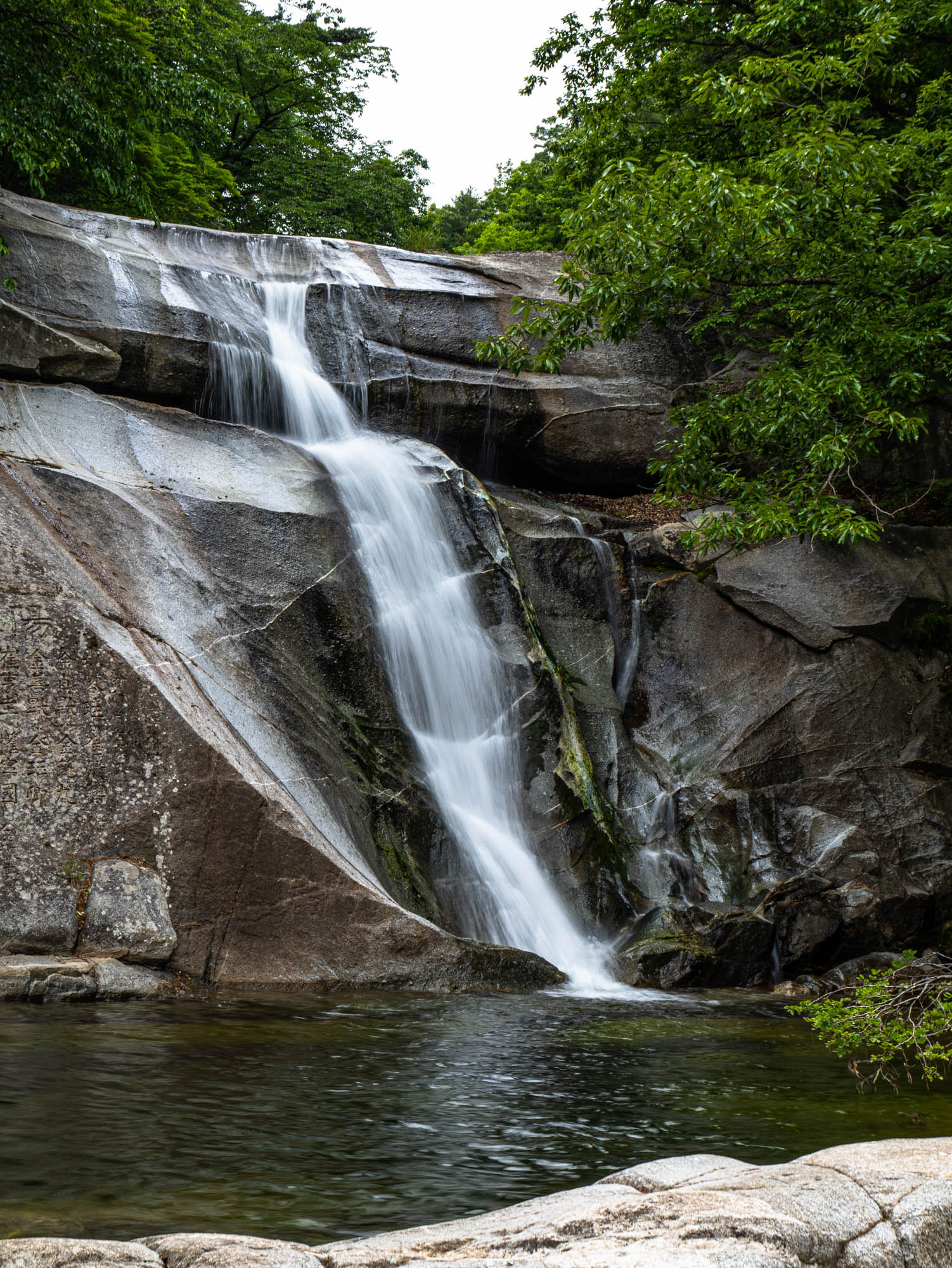 완만한 경사로를 따라 가면 이내 삼포암 폭포가 나타납니다. 너른 바위를 타고 내려오는 물줄기가 시원함을 더해줍니다. 폭포 가운데는 설악산 12선녀탕처럼 복숭아탕이 있는 모습이 특이합니다.