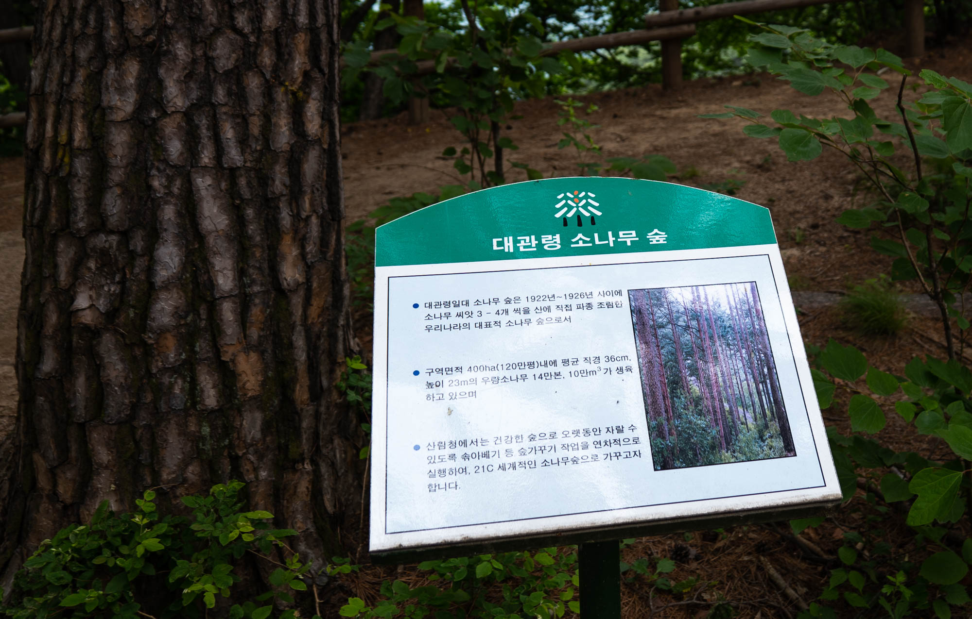 대관령 소나무 숲, 1922~1926년 파종 조림한 우리나라 대표적 소나무숲, 120만평에 둘레 36cm, 높이 23m의 소나무가 14만 그루, 산림청에서 간벌 등 숲가꾸기를 지속적으로 하고 있다는 이야기...