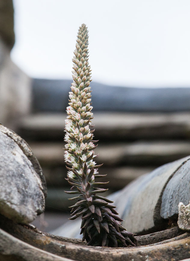 지붕 위의 소나무가 한 뼘 남짓한 키를 올리고 화사한 꽃을 피웠습니다. 와송은 다육질의 잎을 가지고 있기 때문에 건조한 환경에서도 살 수 있는 끈질긴 생명력을 가지고 있습니다. 반대로 습한 곳에서는 자라지 못한다고 합니다. 스스로 척박한 환경에서 견딜 수 있는 체질을 만들어 다른 식물들과의 경쟁을 피하려는 전략입니다.