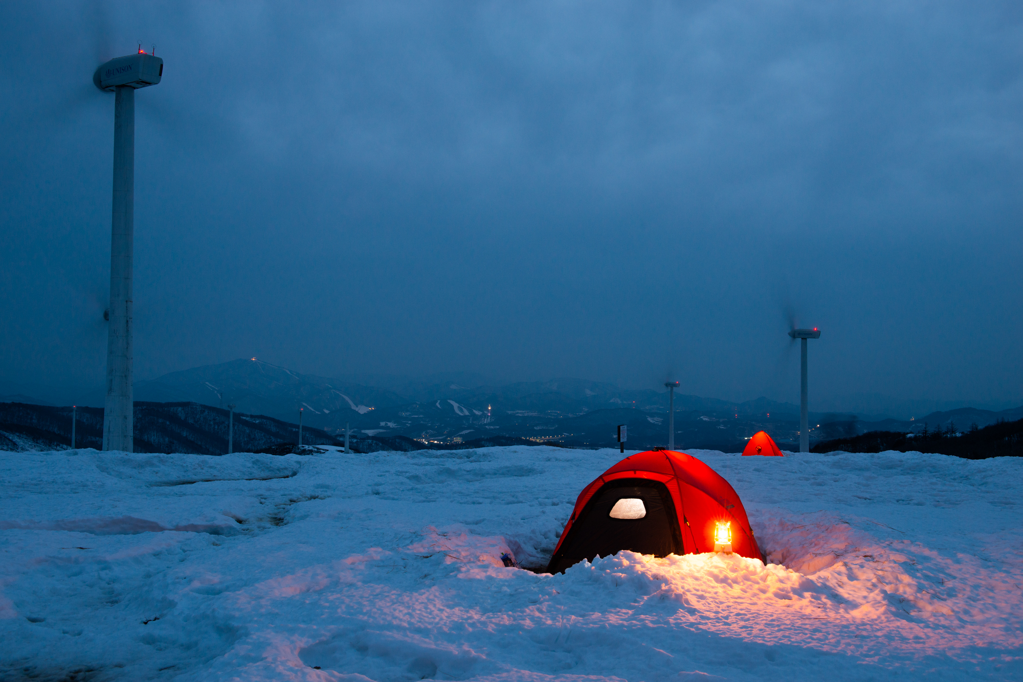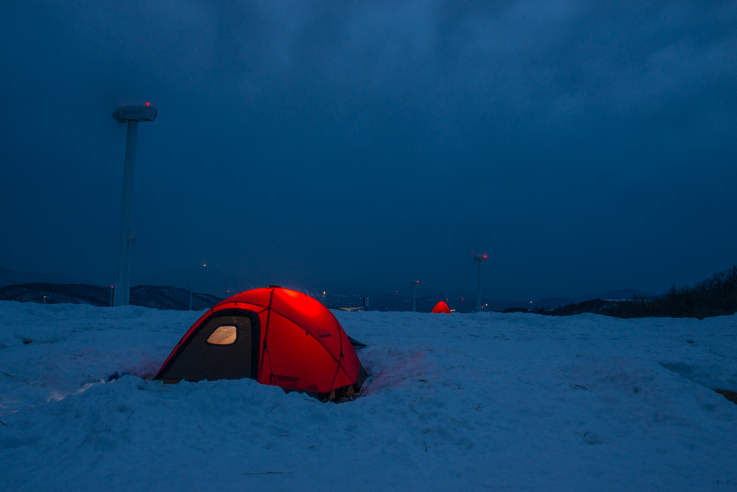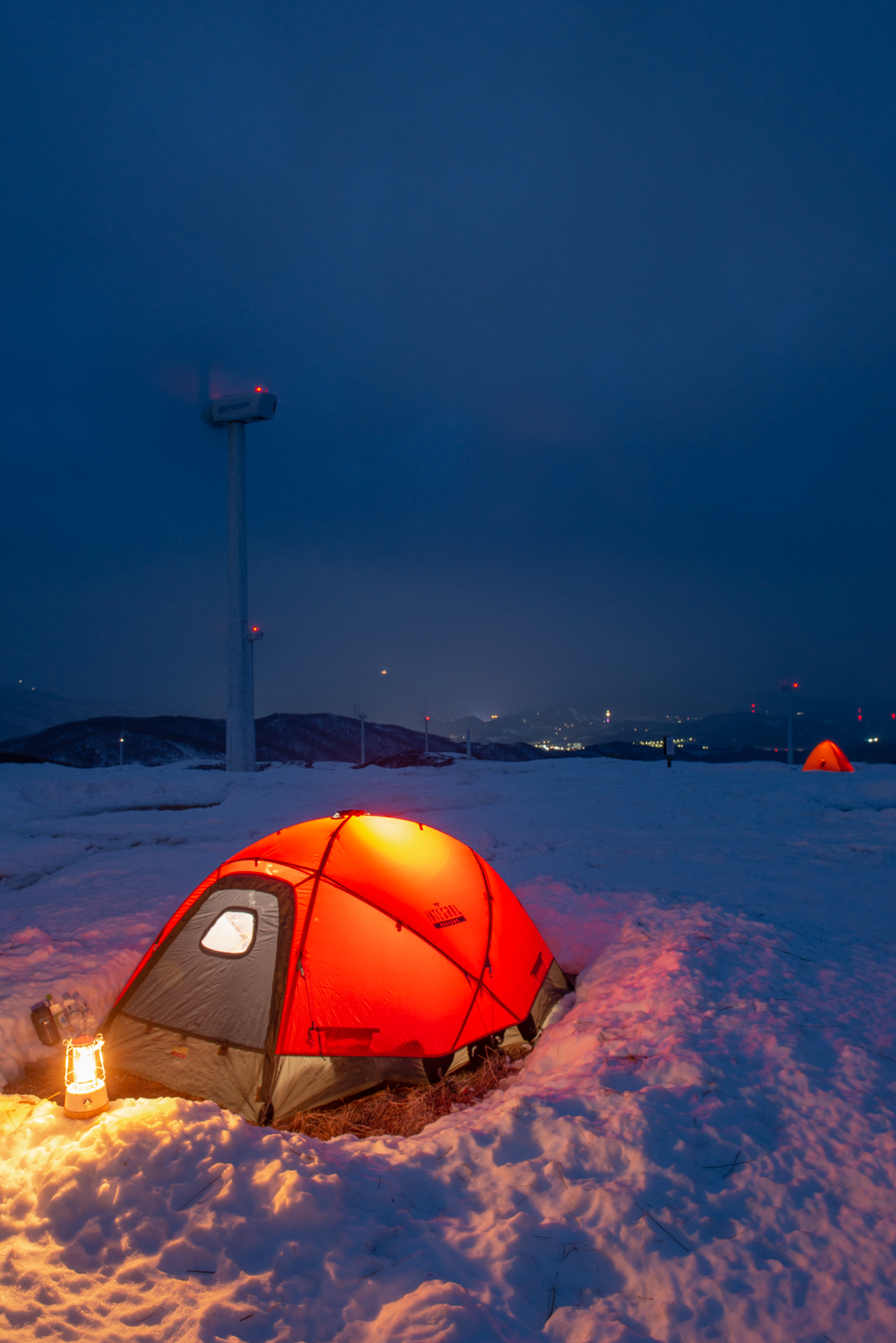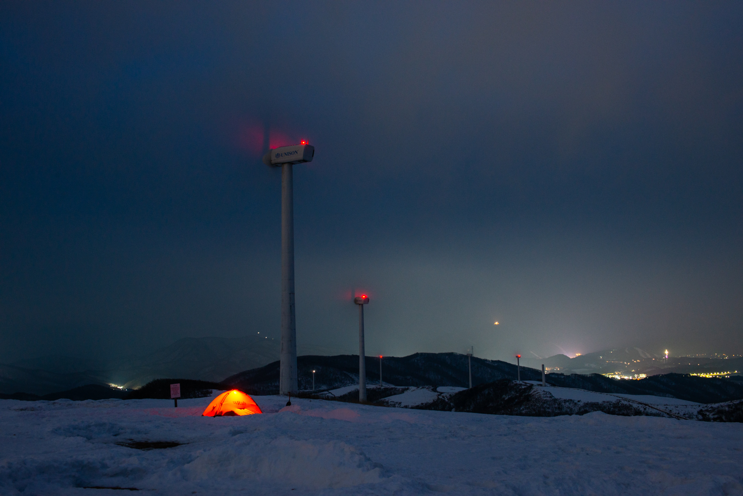지난밤?지지난밤? 누군가가 애 써 파놓은 자리에 텐트를 세우고 불을 밝혔습니다. 풍력발전기의 팬이 붕붕~ 험악한 소리를 내며 돌아가지만 아랫쪽에는 바람이 거의 없습니다. 선자령에서 눈을 보는것과 바람을 맞지 않는 것은 축복이죠.
