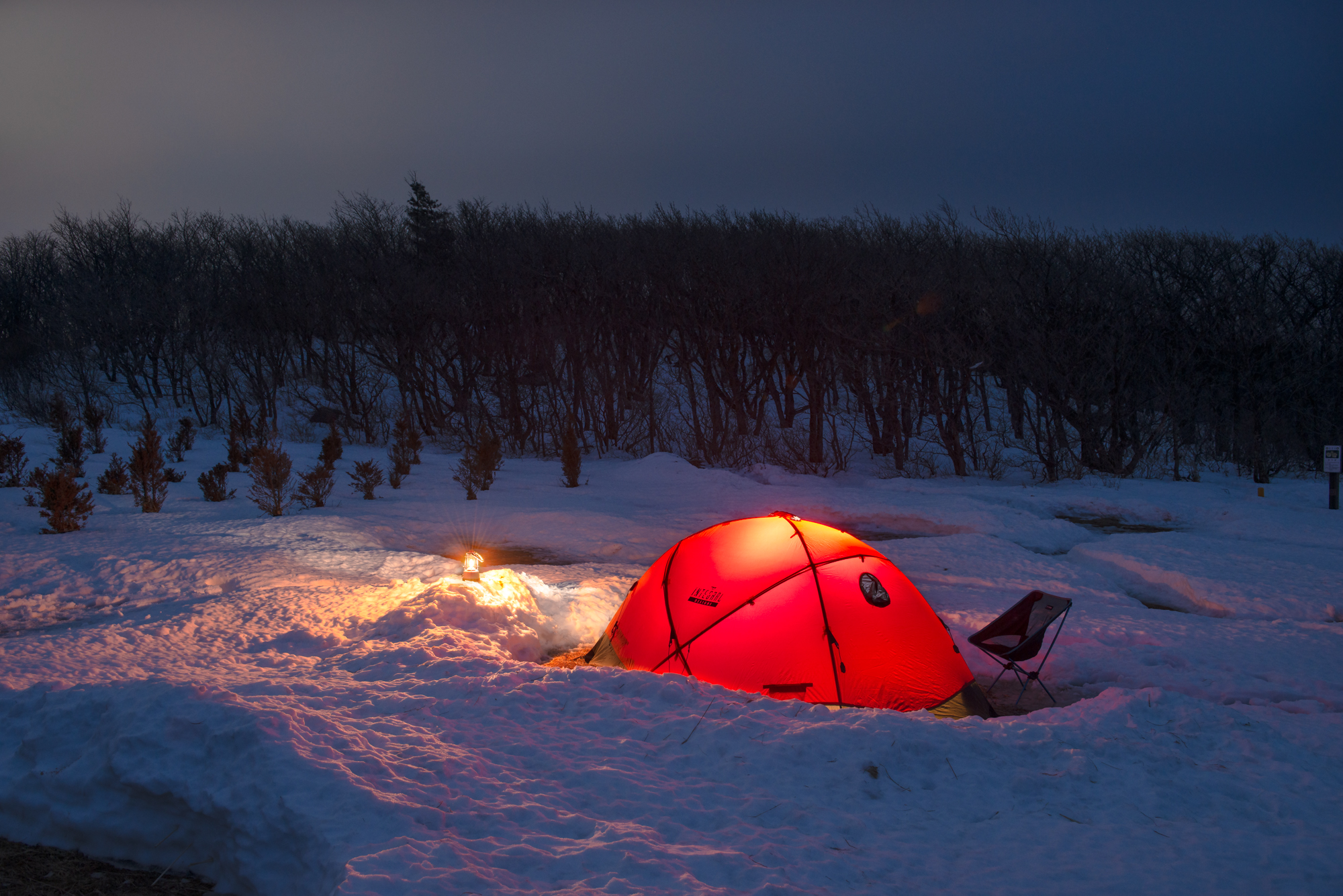 6시가 조금 안되어 도착한 선자령 넓은 들판에는 불을 밝힌 텐트는 달랑 한동 입니다. 저는 좀 더 위로 올라 텐트를 설치 할 자리를 찾습니다. 무릎까지 빠지는 눈 속으로 간간히 드러난 땅에는 물이 흔건히 고여있습니다. 어디에도 마른땅이나 마른 눈은 보이지 않습니다. 그 나마 물이 가장 적은 자리를 찾습니다.
