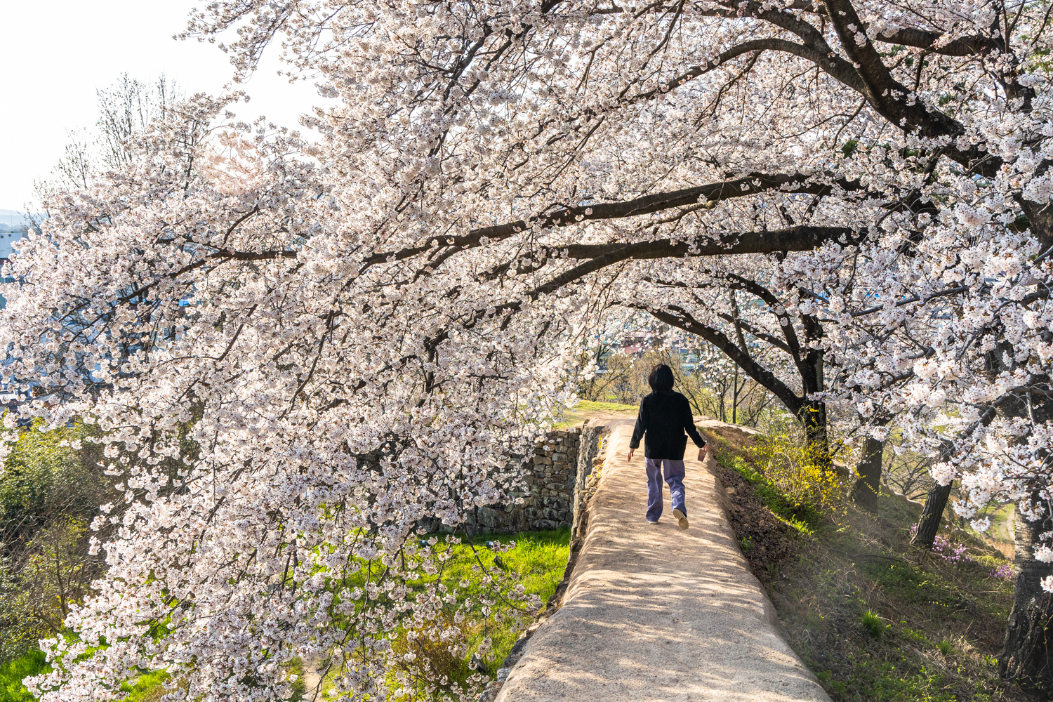 성곽 밖으로 가지를 뻗은 벚나무 덕분에 성곽길은 벚꽃 터널이 됐습니다.