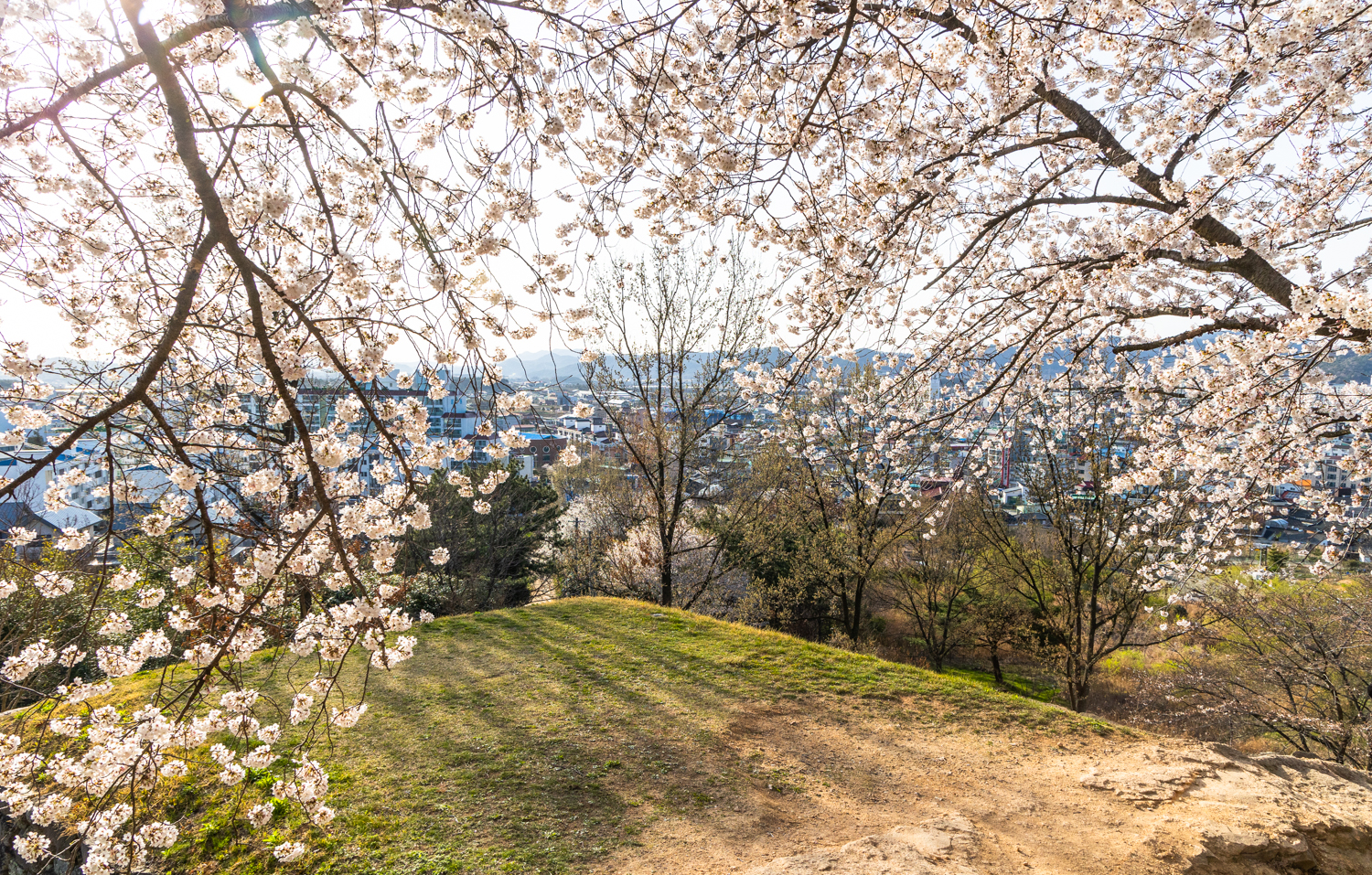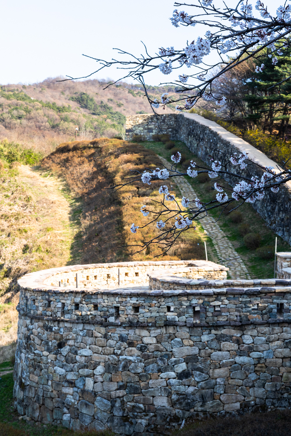 벚꽃의 내림과 성곽의 올림이 만나 둥근 원이 되었습니다. 일 년에 단 삼사일만 보여주는 비밀스런 풍경입니다.