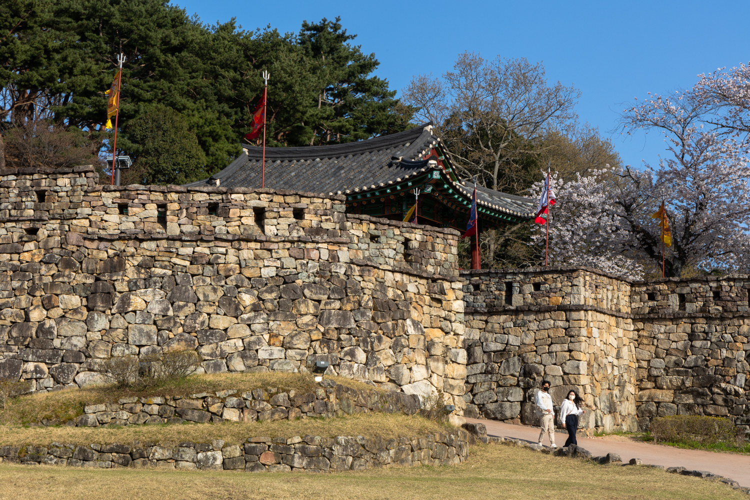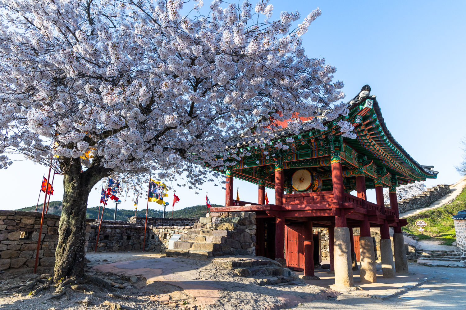읍성으로 들어가면 빨간 단청과 큰북이 있는 공복루, 그리고 오래돼 보이는 벚꽃만개한 벚나무가 성곽을 따라 있습니다.