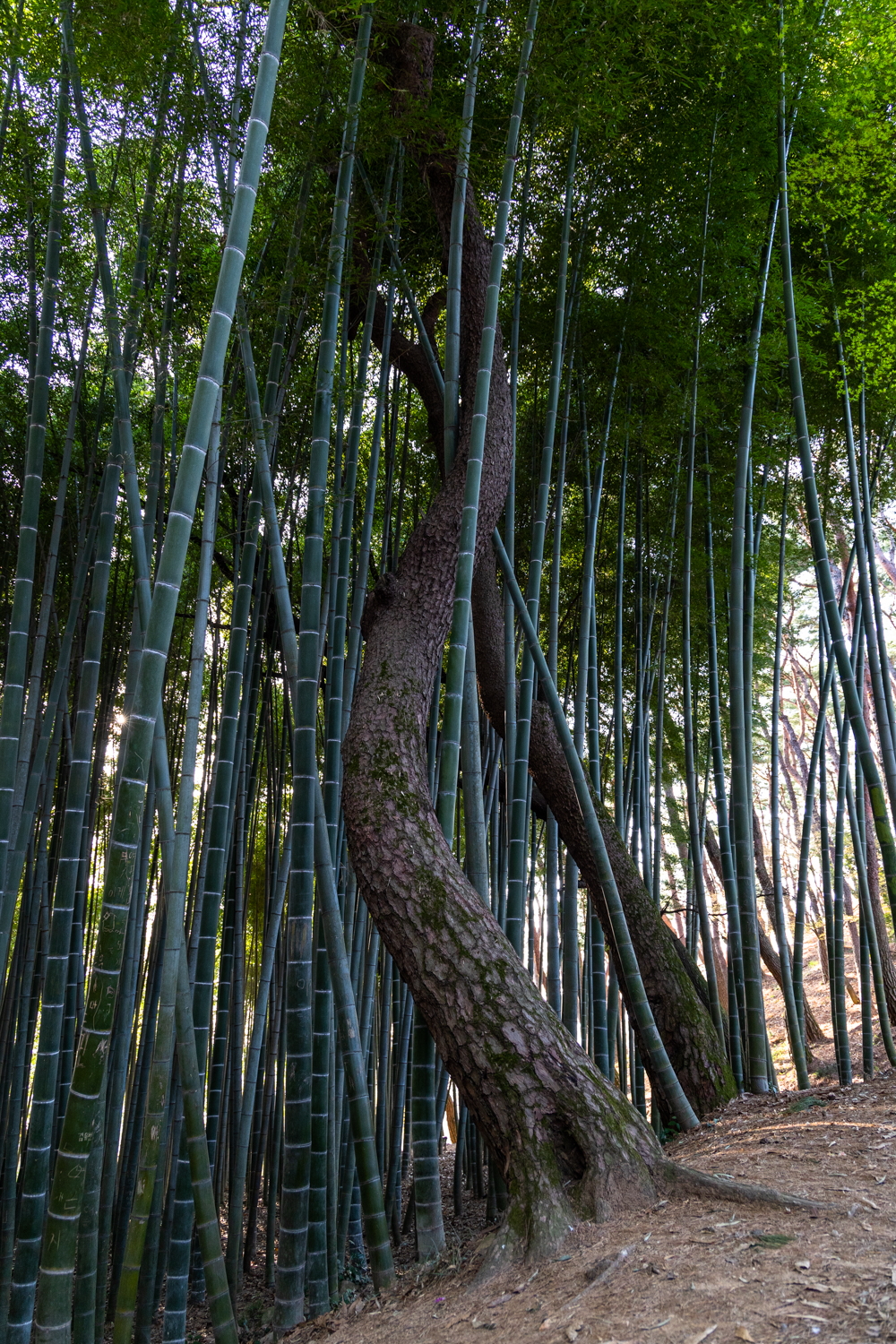 대나무를 휘감은 소나무인가, 구부러진 소나무의 빈 공간에 대나무가 절묘하게 자란 것인가? 저의 생각은 후자 같습니다.