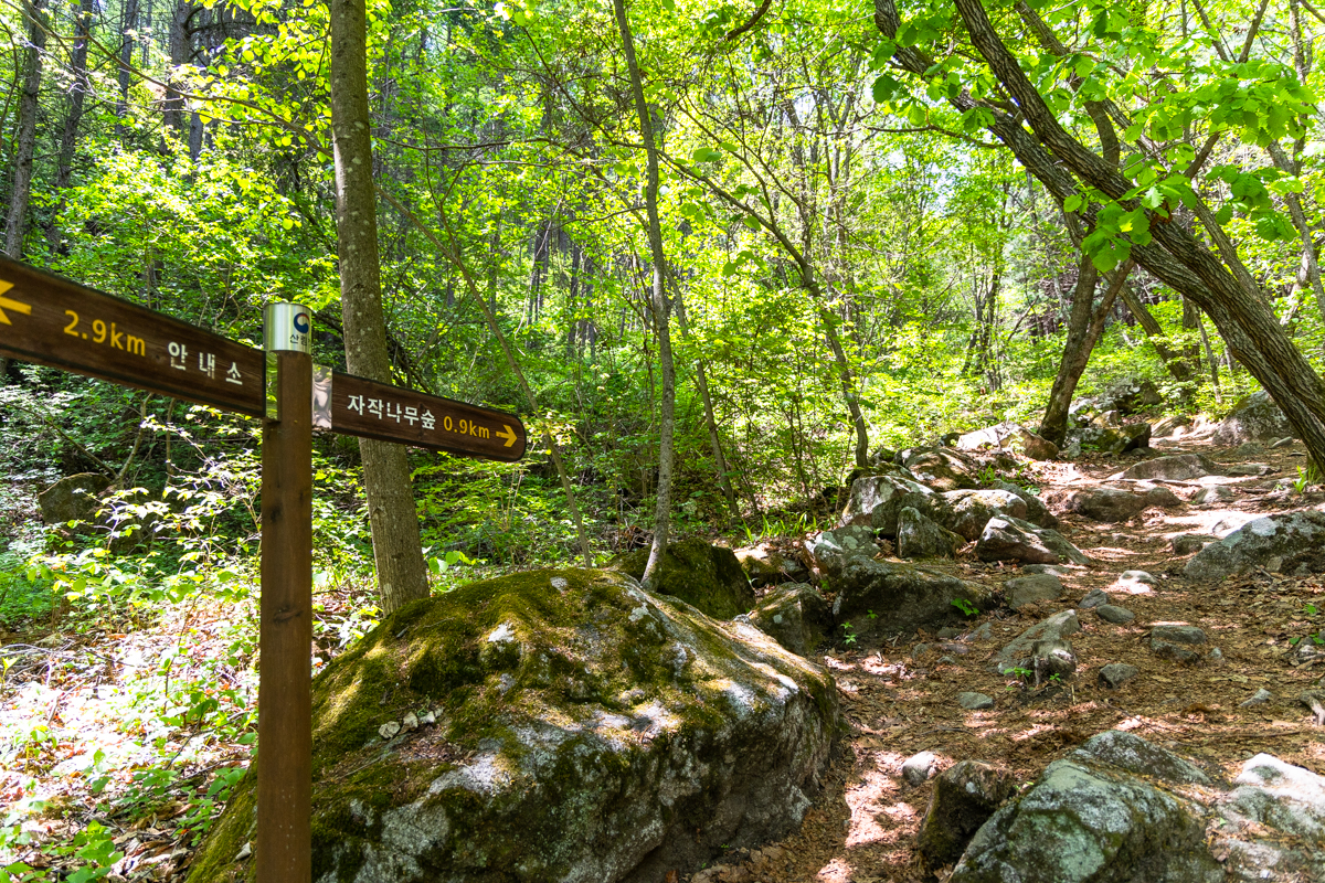 안내소에서 완만한 임도를 따라 2.7km 정도 오르면 여기서 부터는 본격적으로 숲길로 들어가는 3코스가 시작됩니다.