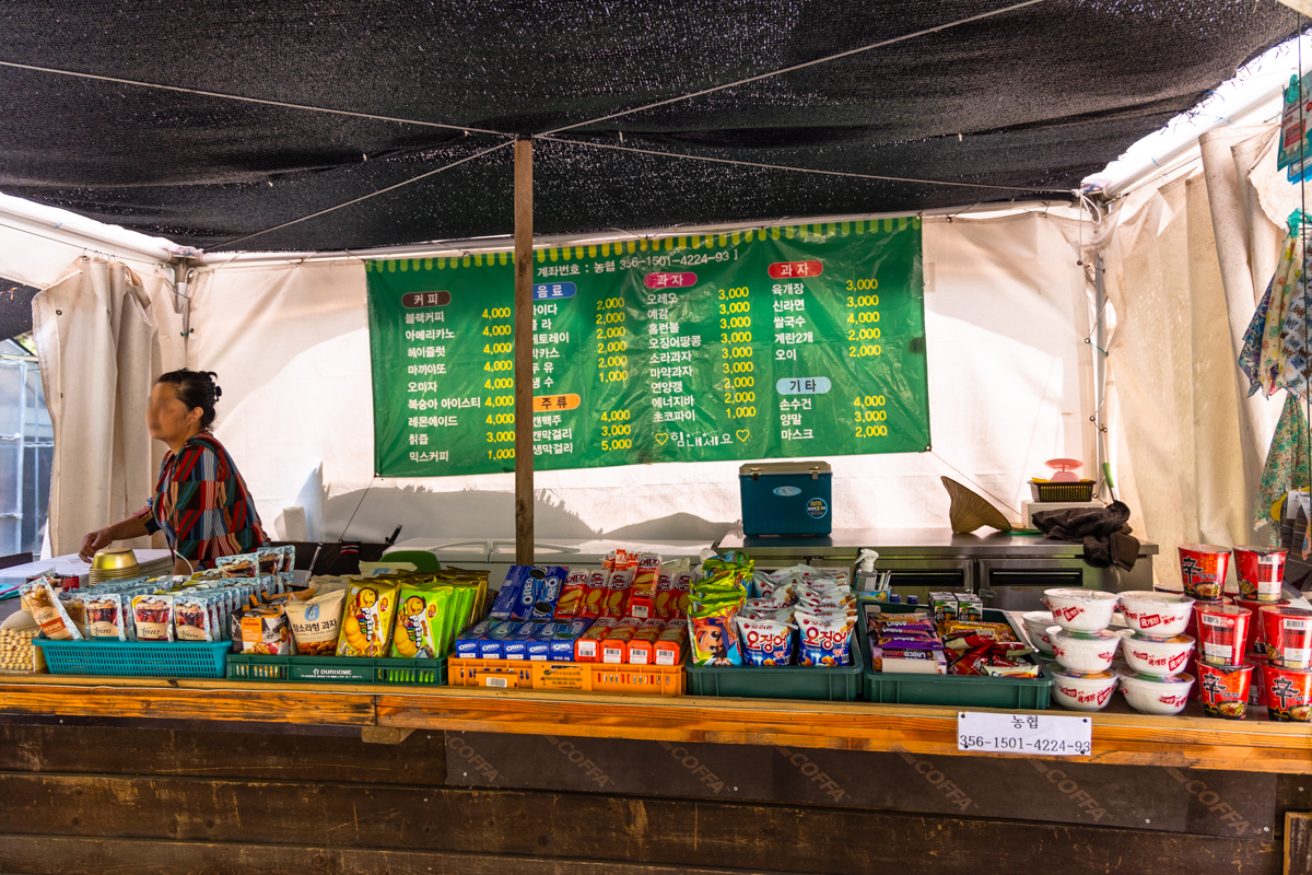 과자, 라면, 음료 같은 먹거리와 맥주 막걸리 같은 술도 팔고 있네요.