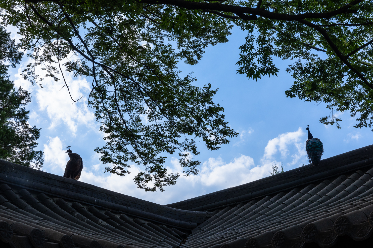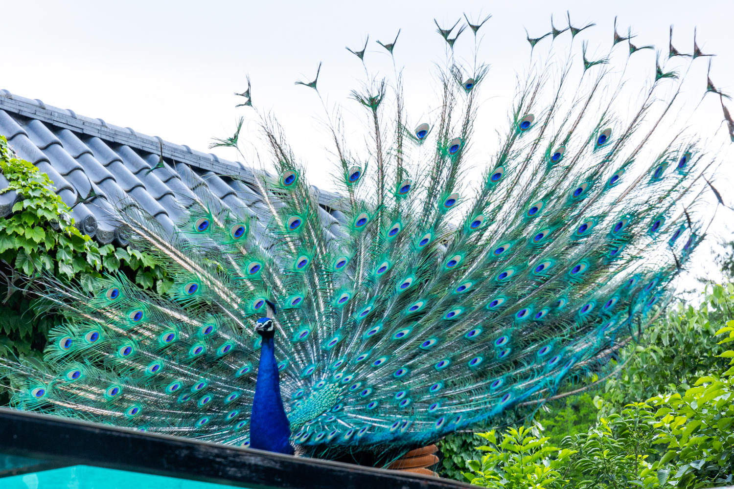 꽥깩거리던 공작이 어떤 지붕위에서 날개를 활짝 펼쳤습니다. 너 상당히 멋져~