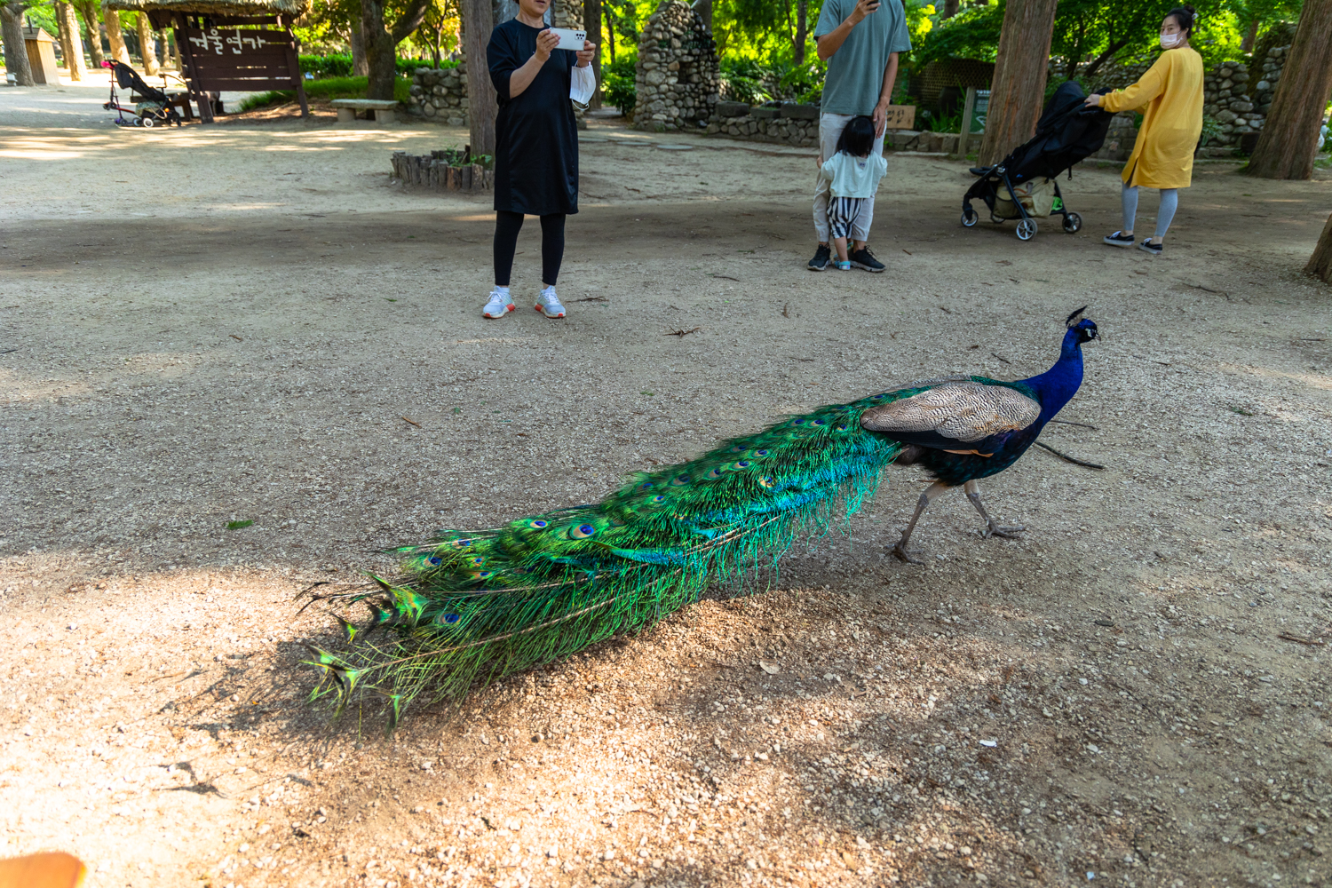 사람들 속에서 유유히 돌아다니는 공작새