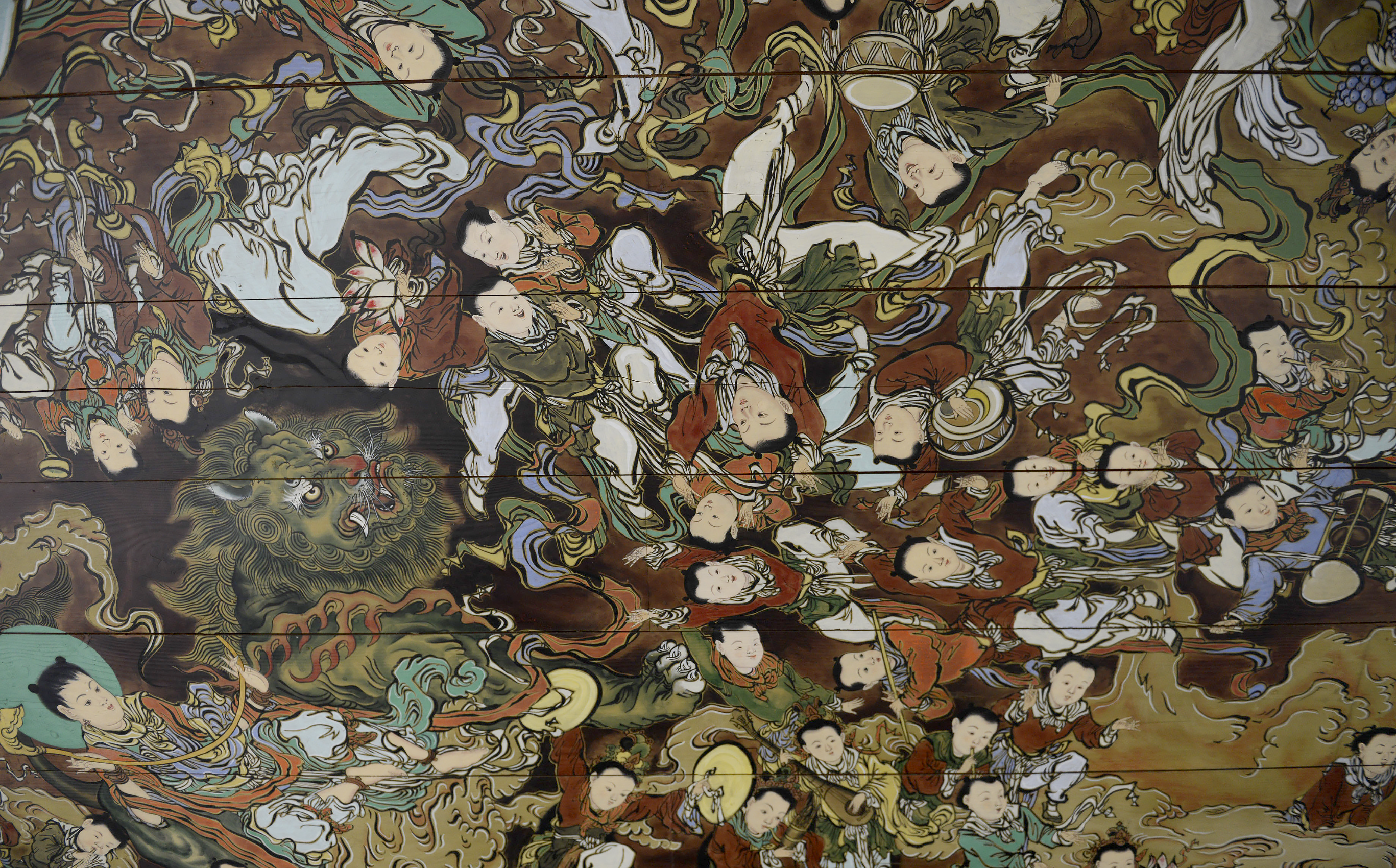 상원사 만화루 누각 아래 천장에는 문수도량이라는 것을 보여주는 문수동자 그림이 그려 있는데 아래 거울로 보면 목이 덜 아픕니다.
