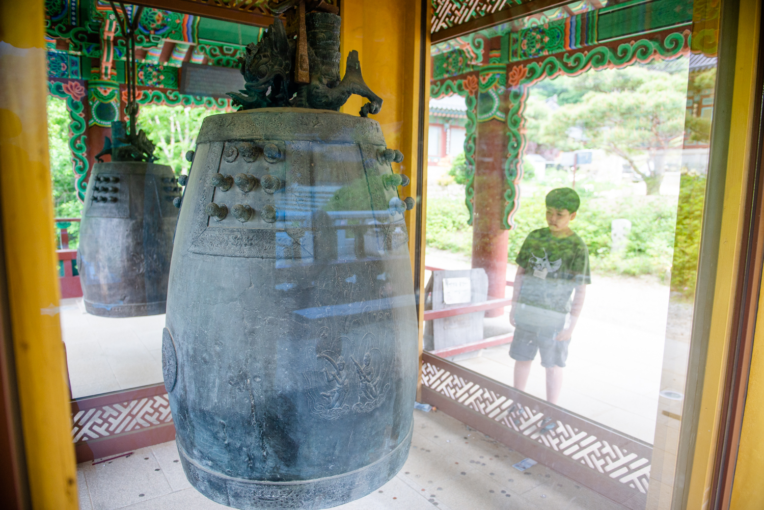 1300년 된 국보 동종 입니다. 보존을 위해 진품은 유리관에 넣어 놓고 바로옆에 이미테이션 동종을 매달아 대신 울리고 있습니다.