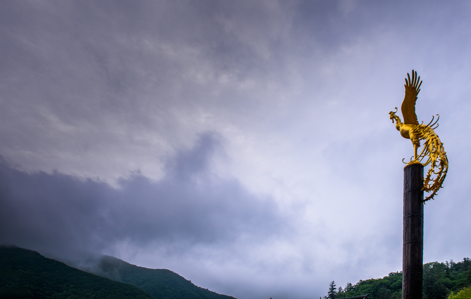 상원사 봉황보당, 긴 장대위에 황금 봉황이 올려진 '봉황보당'은 사찰에 큰 행사가 있을때 탱화 등의 기를 걸었던 대 입니다. 왕실의 원찰임을 알리는 어룡기를 걸었던 당지주가 있어 이를 상징하는 황금빛의 봉황대를 세웠다고 합니다. 이렇게 상원사는 왕실의 후원을 받아 번영을 누렸던 사찰 입니다.