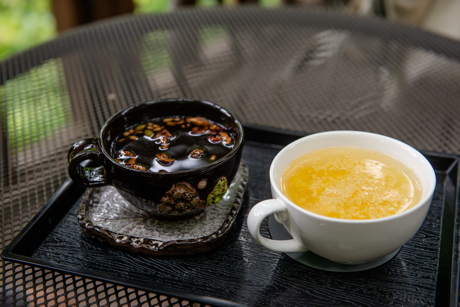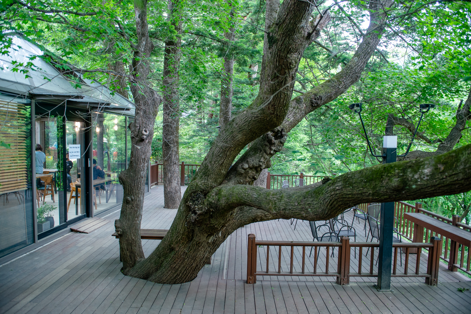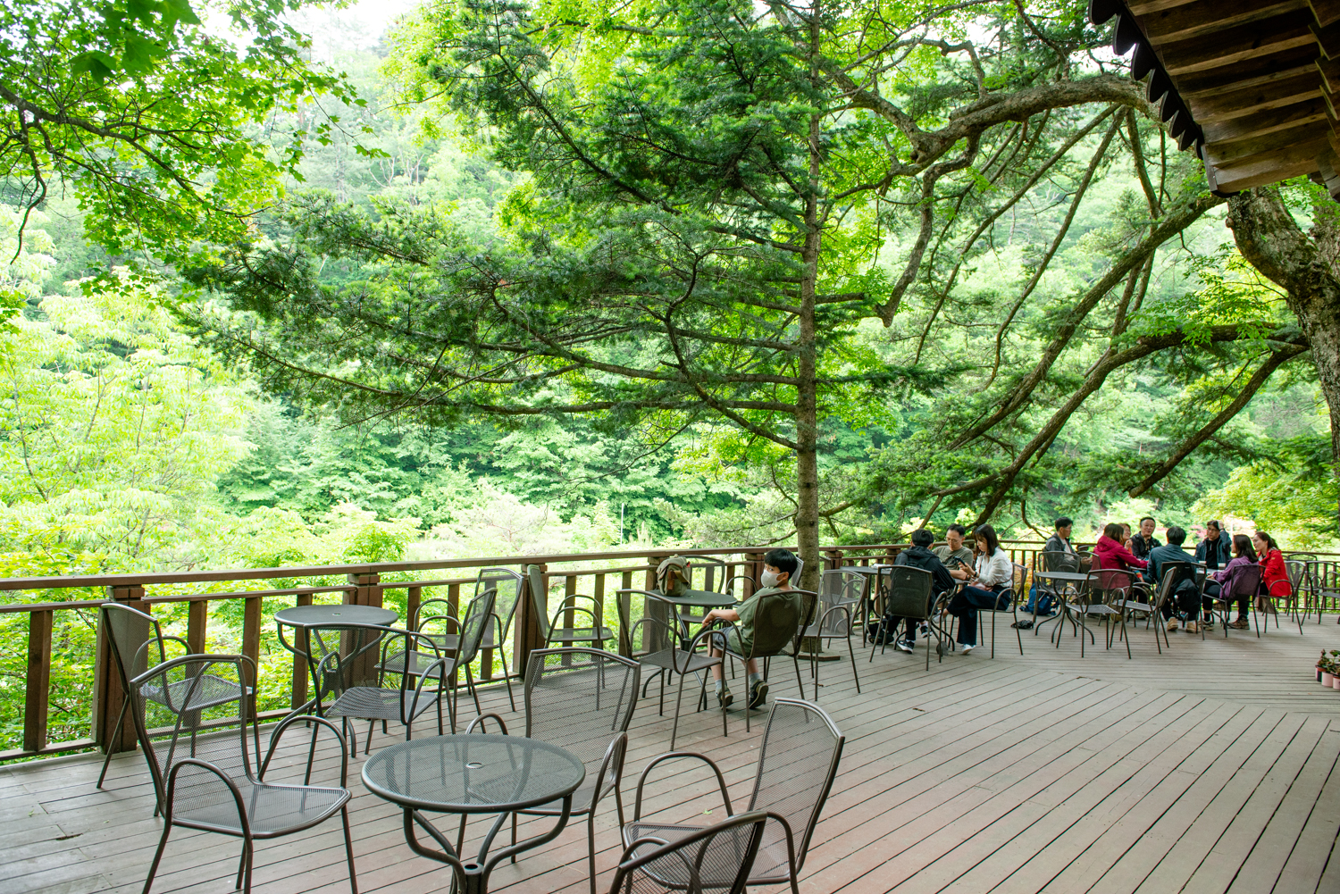 그늘이 드리워진 시원한 야외 테라스에서 전나무숲 길의 느낌을 되새겨 봅니다.