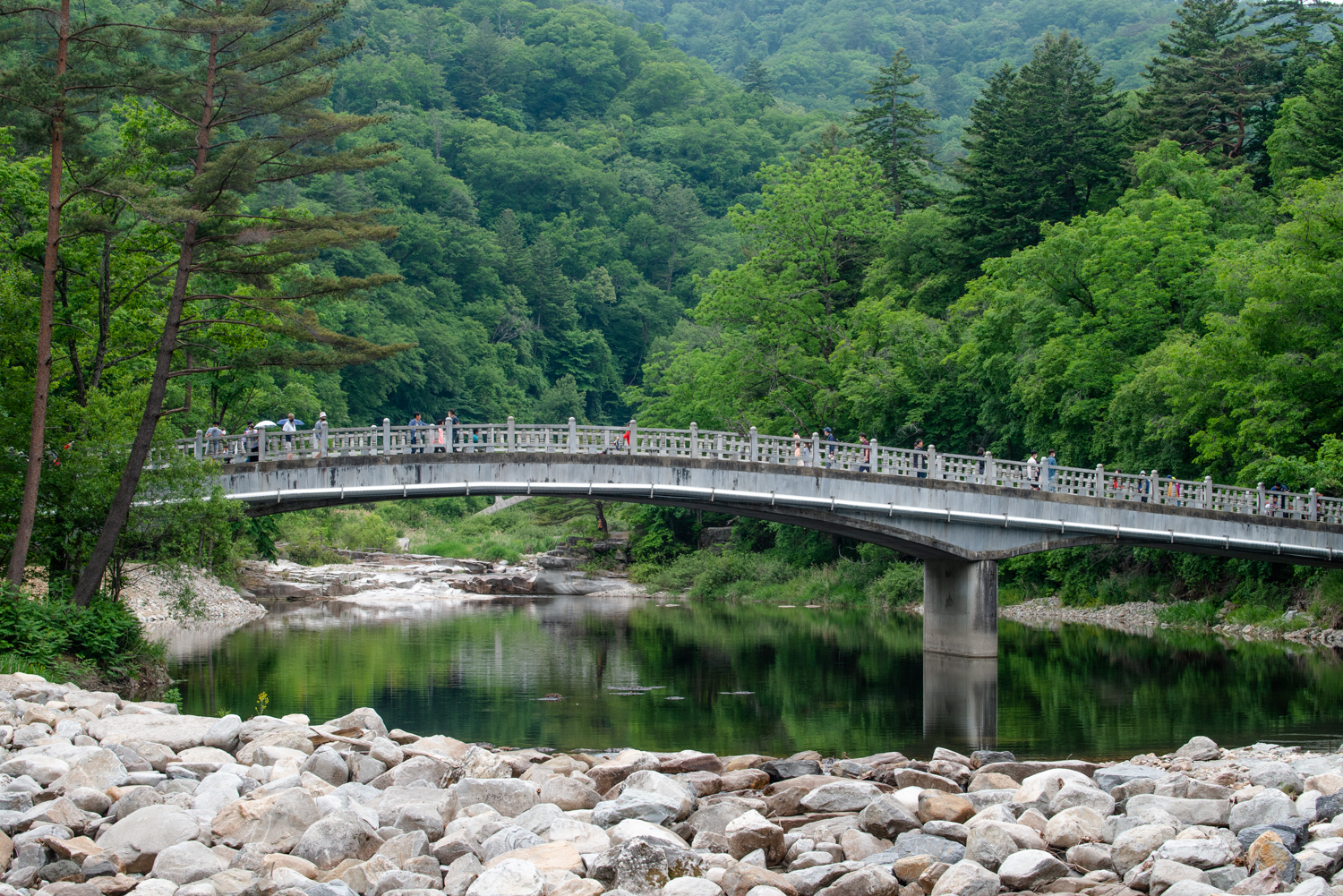 주차장에서 월정사로 들어가는 금강교가 보이면 짧은 전나무숲길 여행은 끝이 납니다. 아래는 계곡에는 천년기념물인 열목어가 산다고 합니다.