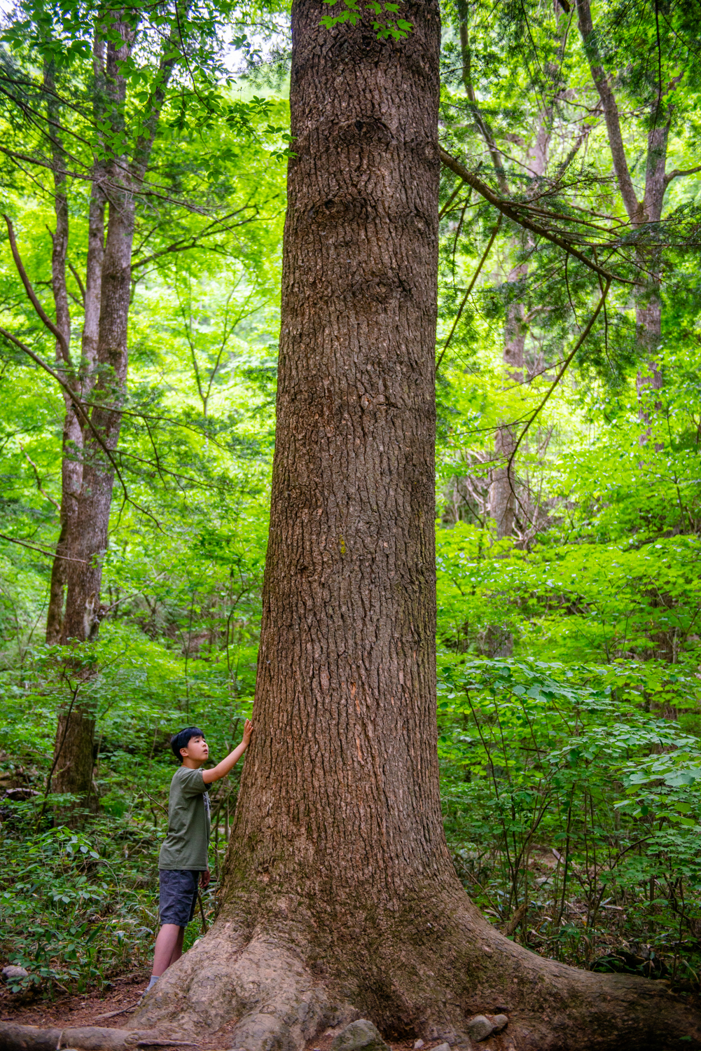 전나무는 대략 25년이 될 즈음 생애 첫 꽃을 피우고 열매를 맺는다고 합니다. 한 그루의 전나무가 평균 100개의 솔방울을 만들고 그 속에 300개의 씨앗이 생산됩니다. 매년 300개의 씨앗이 모두 뿌리를 뻗어 튼튼한 전나무가 된다면 어떻게 될까요? 불가능한 일이겠죠. 지금 아이가 마주 하고 있는 전나무 한그루는 1억분의 1의 확률로 살아 남아 하늘높이 키를 올린 경이로운 생명 그 자체 입니다.
