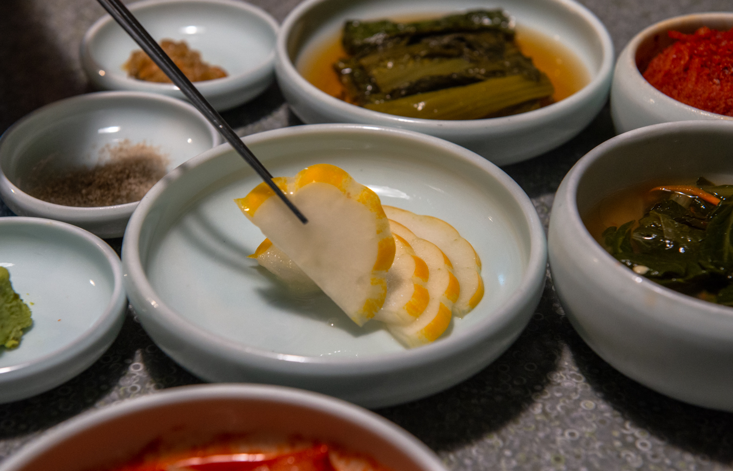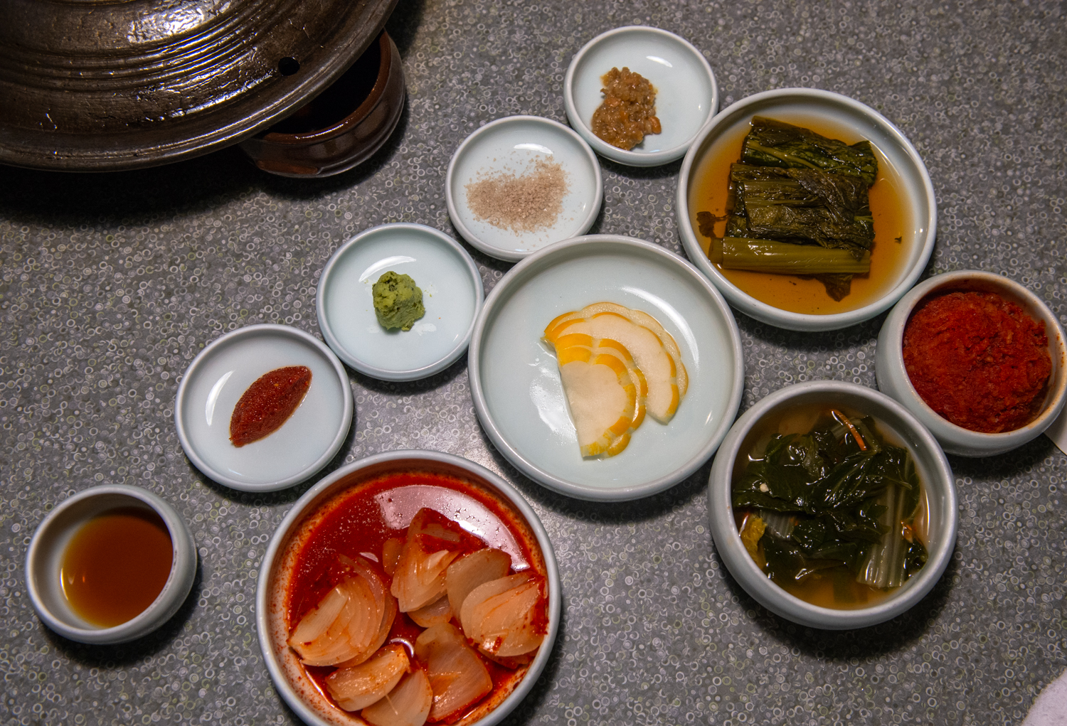 양파김치와 참외 장아찌, 갓장아찌, 물김치, 김치속이 기본 찬으로 나오고, 고기와 함께 먹을 간장, 청어알젓,명이나물을 섞은 와사비, 소금, 보리된장이 나옵니다. 반찬도 특이 하고 장류도 색다름니다.