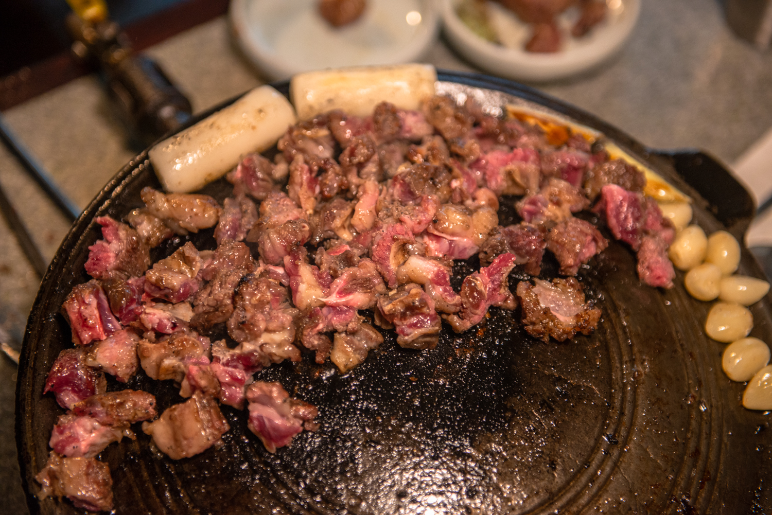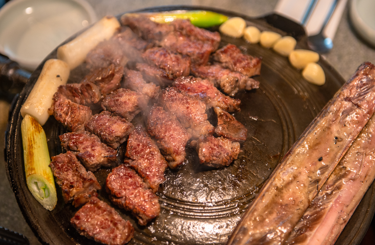 갈빗살을 다 먹고 나면 갈빗대에 붙은 근막부위를 구워 줍니다. 그런데 고기 양이 생각보다 많습니다. 가래떡과 대파 마늘과 같이 곁들여 먹어서 심심하지가 않습니다.