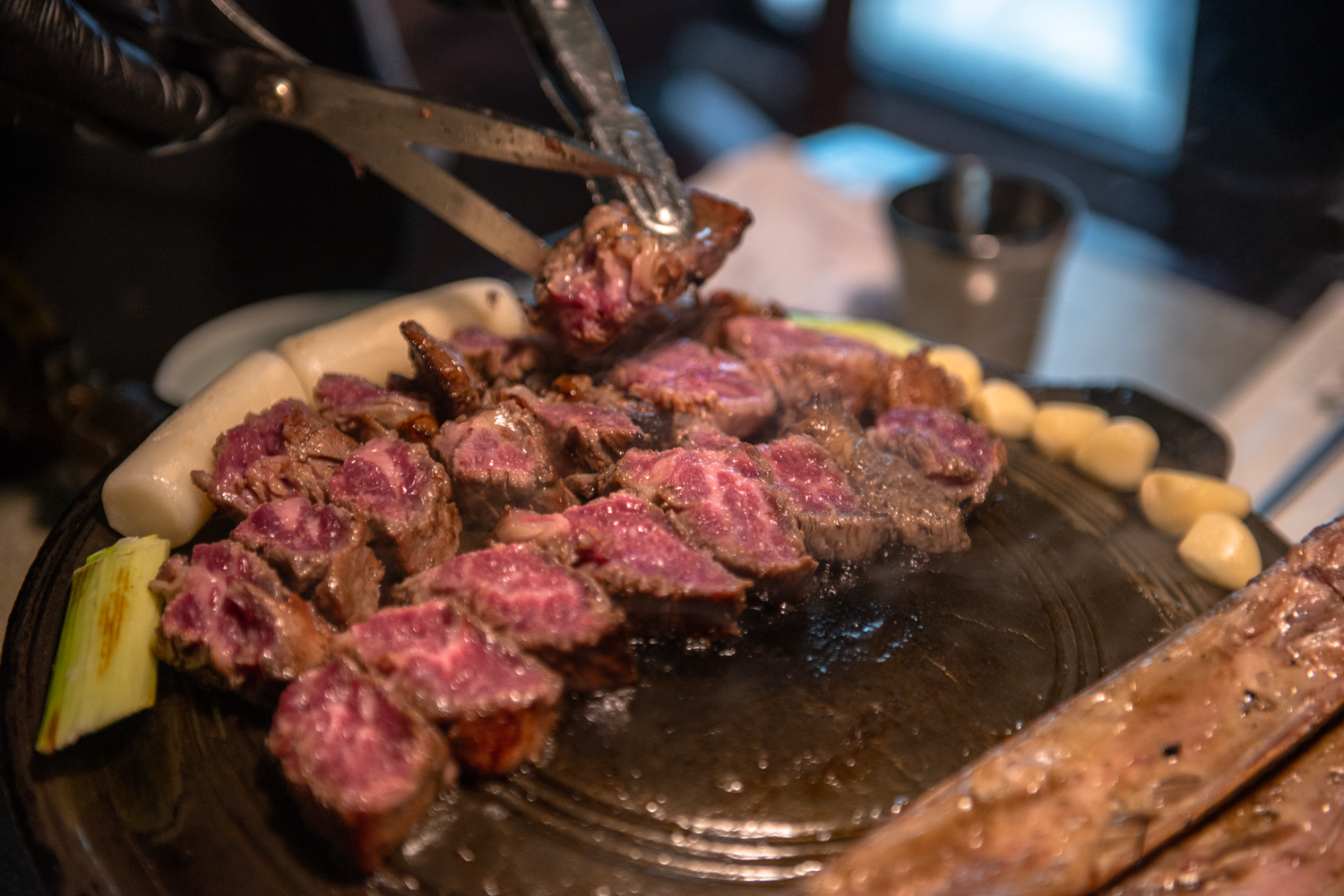 갈빗대에서 갈빗살을 분리 하고 가마솥뚜껑에서 구워지고 있습니다. 우대갈비는 1인분 280그램에 28000원 입니다. 100그램당 만원 꼴입니다. 미국산 소고기라 더 부드러운가 봅니다.