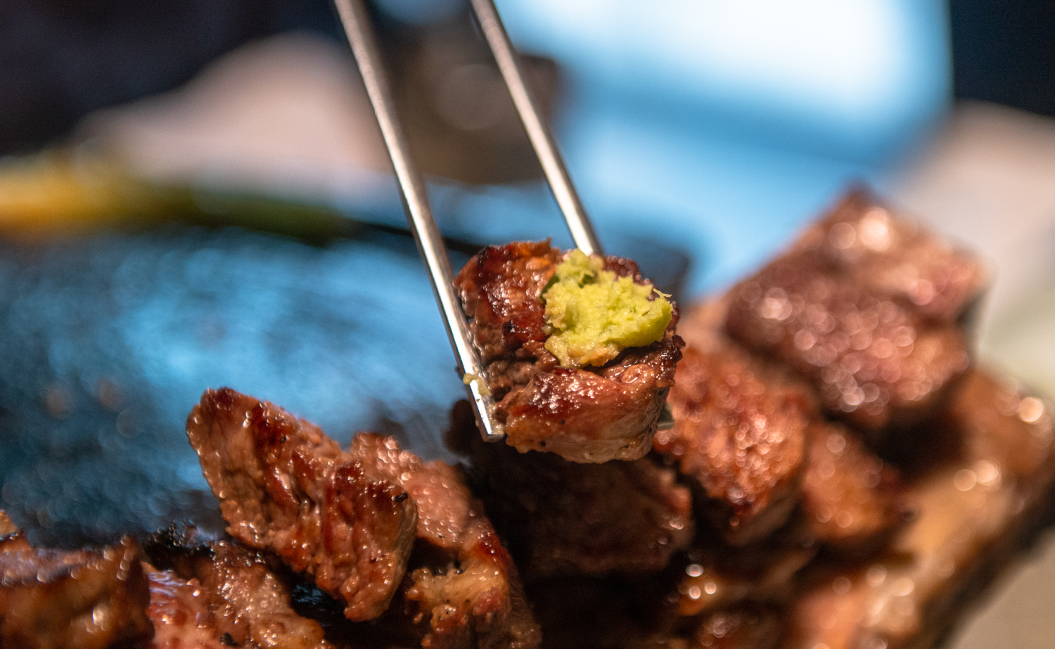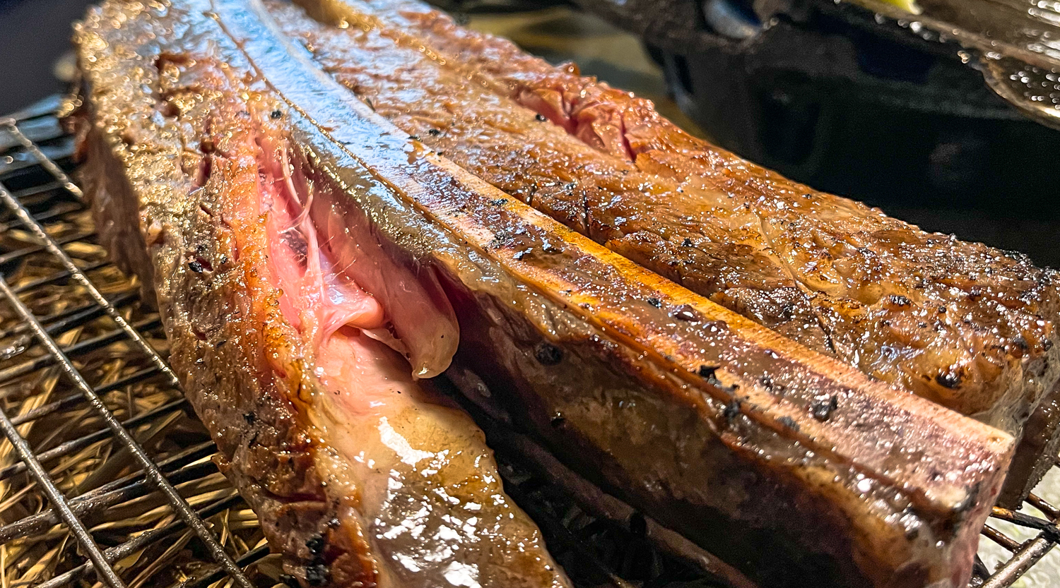다 구운 고기는 갈빗대 위로 올려 줍니다. 이때부터 먹기 시작합니다. 달달한 향과 부드럽고 달달한 감칠맛이 맛있습니다. 훈연향은 정확히는 모르겠지만 히코리향과 비슷합니다.