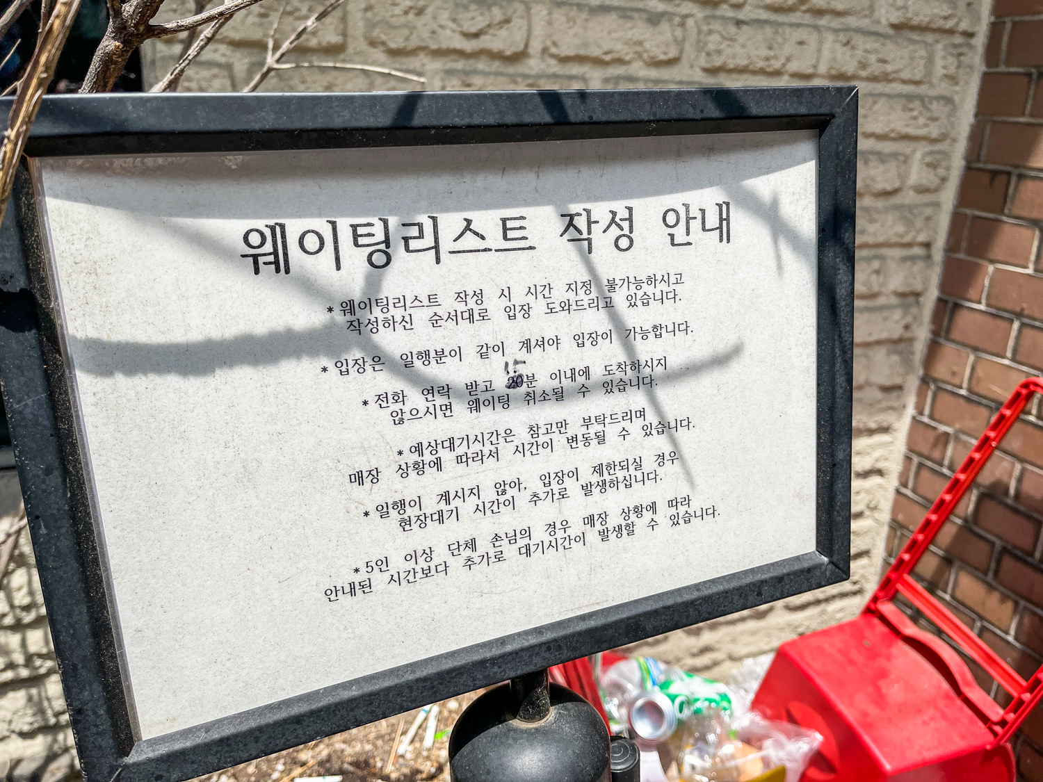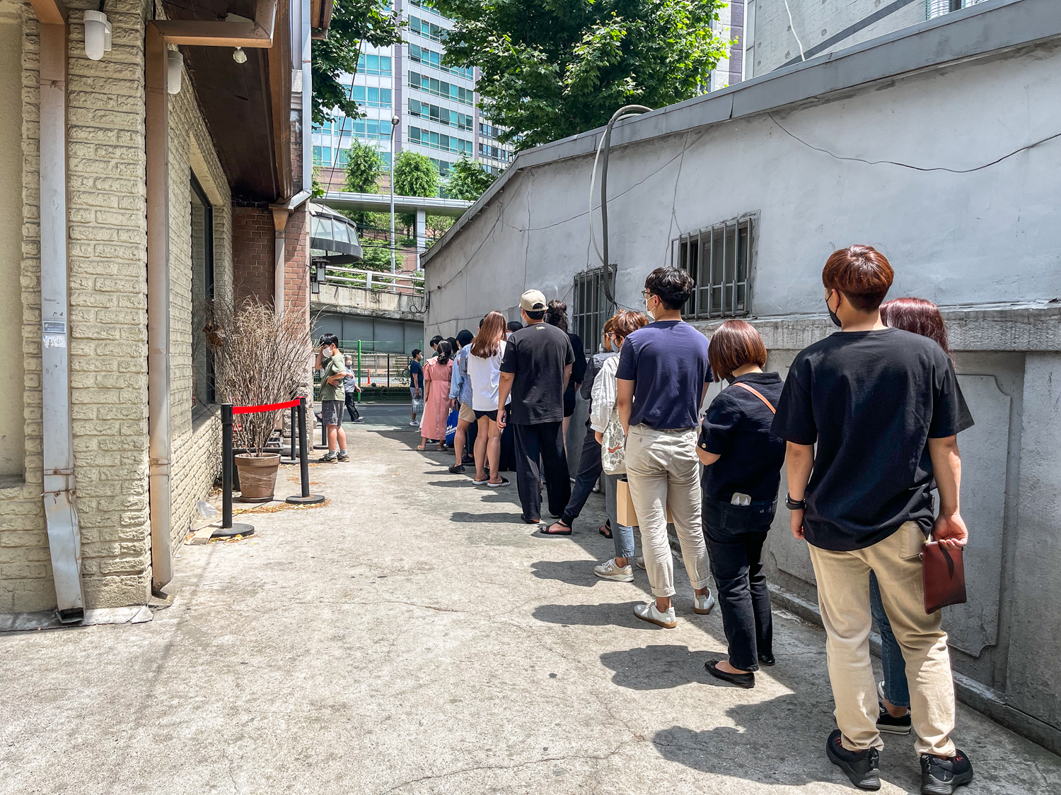 도대체 어떤 곳이길래 이렇게 줄이 길단 말인지 호기심 반 오기 반으로 시간을 잡아 웨이팅 시도를 해 봅니다. 찾아간 때는 일요일 오전 11시 40분 경, 조용한 동네 식당 앞 좁은 골목은 사람들로 길게 줄이 이어져 있습니다. 11시부터 예약을 시작하니 그 이전 부터 줄을 서 있던 사람들 입니다.