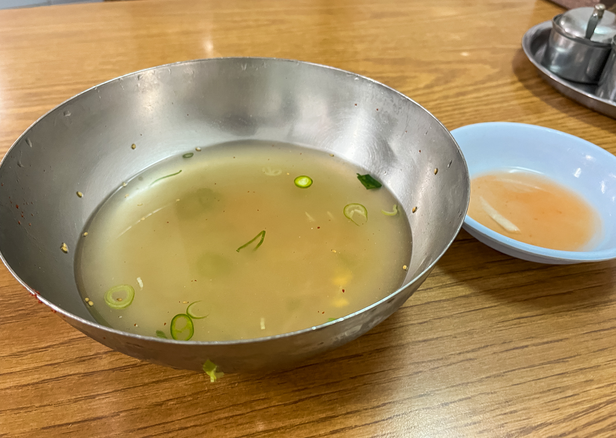 자리에 앉으면 뜨끈한 면수가 한잔 나옵니다. 다른곳과 달리 구수한 숭늉을 마시는 것 같습니다.