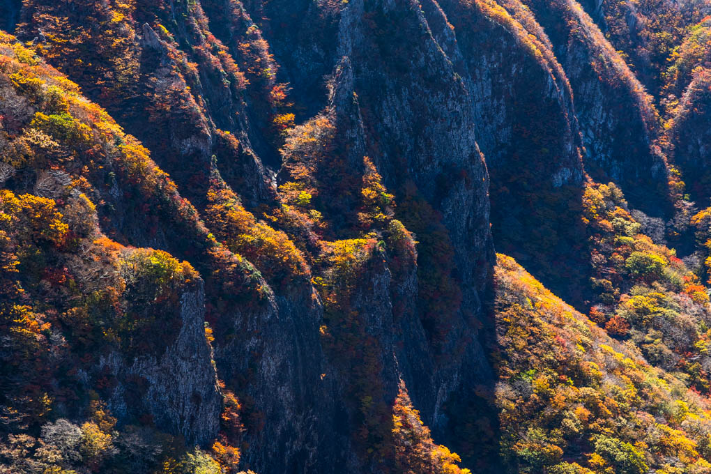 영실기암절벽을 따라 아래로 뻗어 있는 황홀한 단풍의 향연입니다.