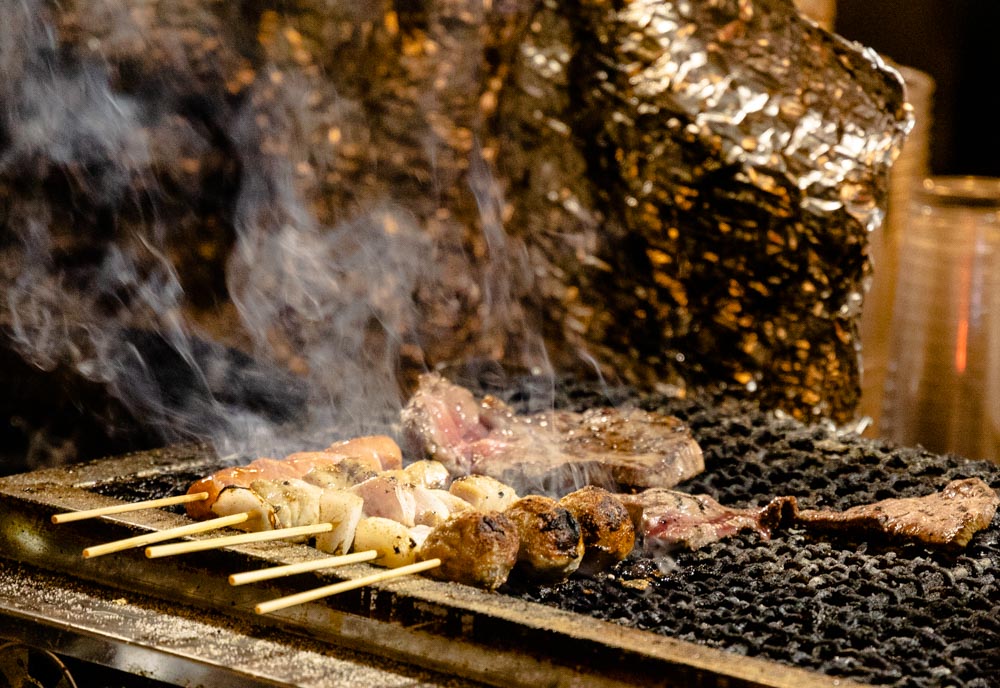 꼬순내 자극하는 꼬치가 노릇노릇 구워지고 있습니다.
