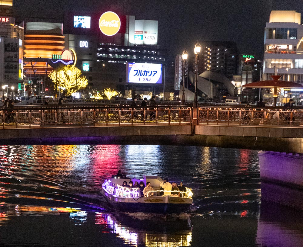 텐진거리를 흐르고 있는 텐진강의 풍경입니다. 텐진강은 후쿠오카의 대표적인 강 중 하나로, 시내를 가로지르고 있어서 시내를 따라 걷거나 자전거를 타며 강을 따라 여행하기도 좋은 장소입니다.