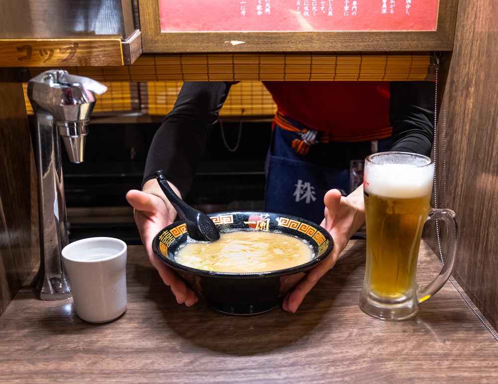 좌석에 앉으면 얼마 후 앞에 대발이 쑥 올라가면서 주문한 생맥주와 라멘이 들어옵니다.