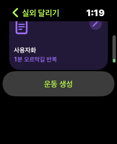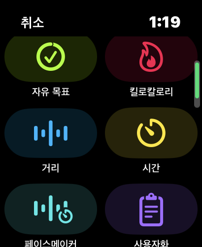4.크라운을 돌려 아래로 가면 새로운 '운동 생성' 창이 나타납니다. 자유목표,칼로리,거리,시간, 사용자화 등의 선택 옵션이 나옵니다. 저는 사용자화를 탭합니다.