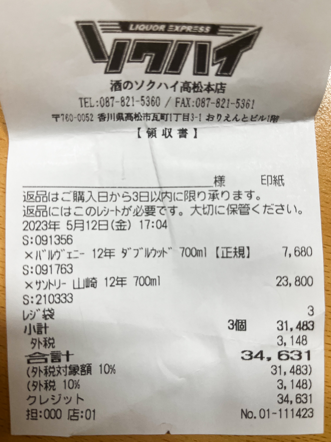 야마자키 12 23,800엔, 발베니 더블우드 7,680엔 10%세금에 더해져 총 34,631엔...