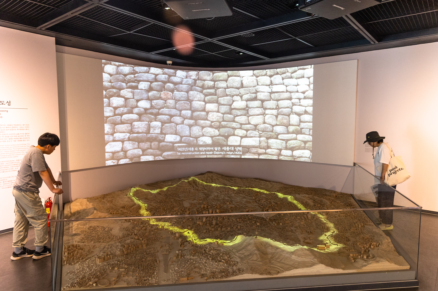 박물관 1층의 한양도성 디오라마, 네 산을 연결해 쌓은 한양도성에 대해 설명해 주고 있습니다.