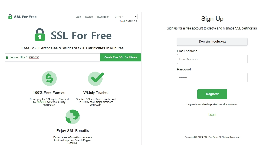 무료 SSL 인증서를 발급받기 위해서는 다음과 같이 화면대로 진행하면 되는데요, 영문이 어렵다면 한글번역을 통하면 간단하게 적용할 수 있습니다.