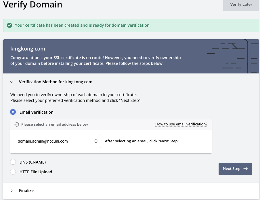 인증서를 발급받기를 클릭하면 입력한 도메인에 대한 소유를 확인해야 합니다. 이메일과 DNS, HTTP File Upload 같은 방법이 있는데 저는 이메일 주소로 받는 방법을 선택하겠습니다. 본인의 메일 주소를 넣고 오른쪽의 Next Step 버튼을 누르고 나서 메일을 확인하면 ZeorSSL에서 메일이 와 있을 것입니다.