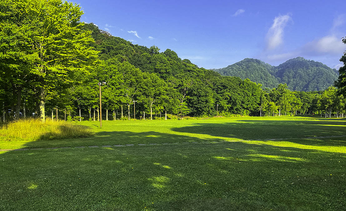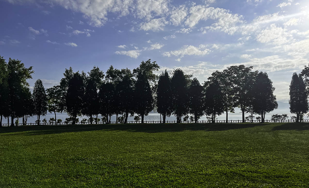 왼쪽으로는 넓은 잔디와 숲속길이 이어지고 오른쪽으로는 도야호수가 펼쳐져 있습니다. 도야호수 조각공원이 나타납니다.