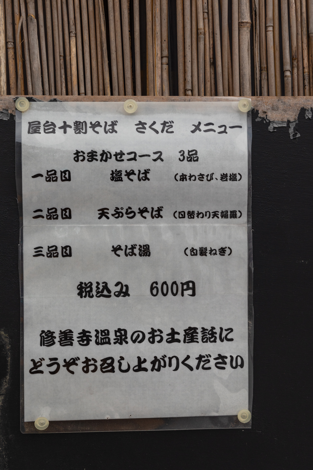 슈센지 온천마을의 조용한 골목길과 옛집들, 시골의 정취가 듬뿍 베어 있는 조용한 시골 마을입니다. 5분 정도 골목길을 걸어가면 사쿠다 소바를 만날 수 있습니다.