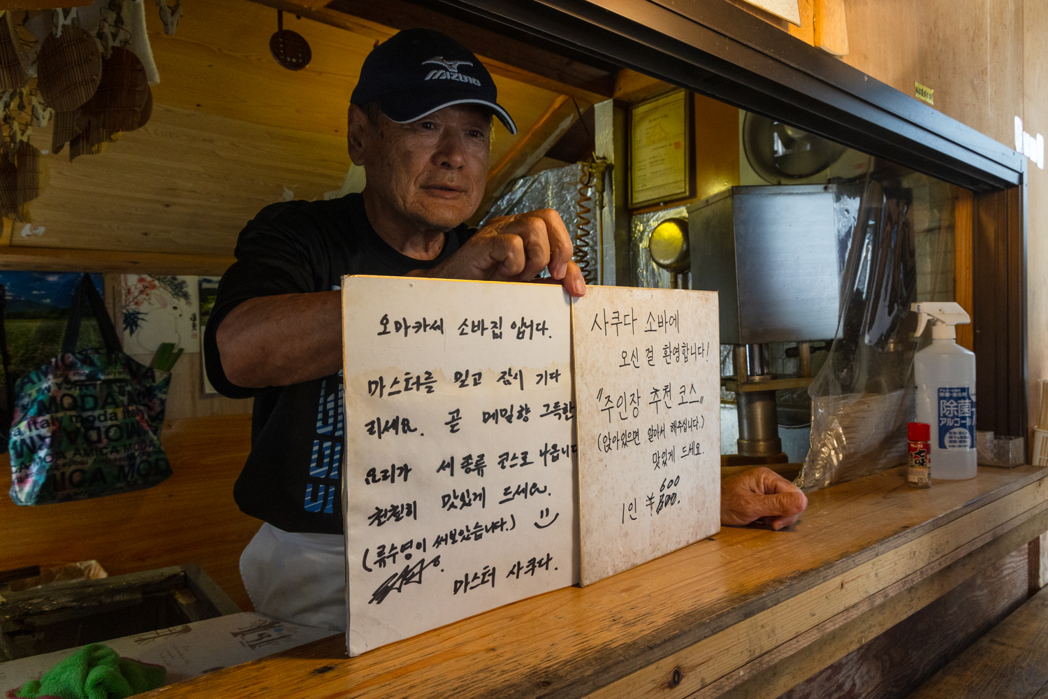 펀스토랑에서 어남선생 류수영씨가 쓴 "마스터를 믿고 잠시 기다리세요, 곧 메밀향 그득한 요리가 세 종류 코스로 나옵니다. 천천히 맛있게 드세요."라는 글을 보여 줍니다. 얼마 전 펀스토랑 류수영 씨가 다녀가면서 써 주고 갔다고 합니다. 소바 오마카세의 가격은 1인에 600엔, 우리나라 돈으로 5200원 밖에 하지 않습니다.
