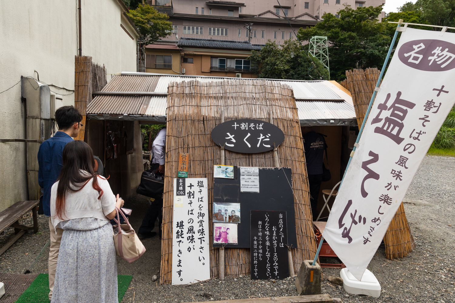 겉보기에 허름한 움막같은 이곳이 사쿠다소바 가게입니다. 시오소바, 주와리소바의 풍미를 즐겨보세요~라는 깃발.