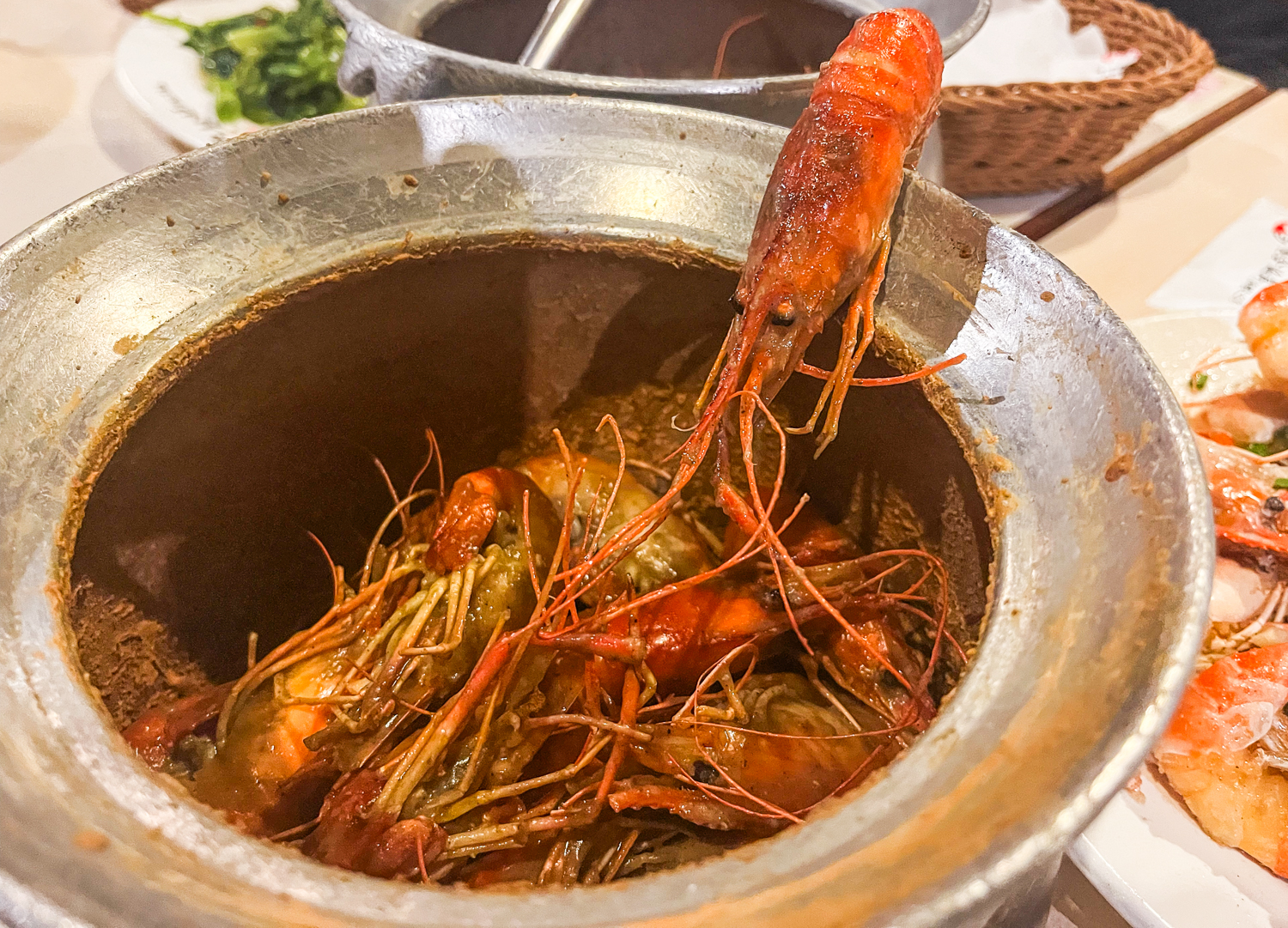 이 식당은 요강처럼 생긴 알루미늄 항아리에 새우를 넣고 구워 나오는데 처음 보는 요리방법이라 재미가 있습니다. 메뉴로는 페퍼새우, 갈릭새우, 참기름새우, 레몬새우, 새우전골에 돼지 등뼈 튀김, 오징어 튀김, 머드 크랩과, 바다 달팽이 요리에 공심채, 양배추 볶음 같은 다양한 메뉴가 있습니다.