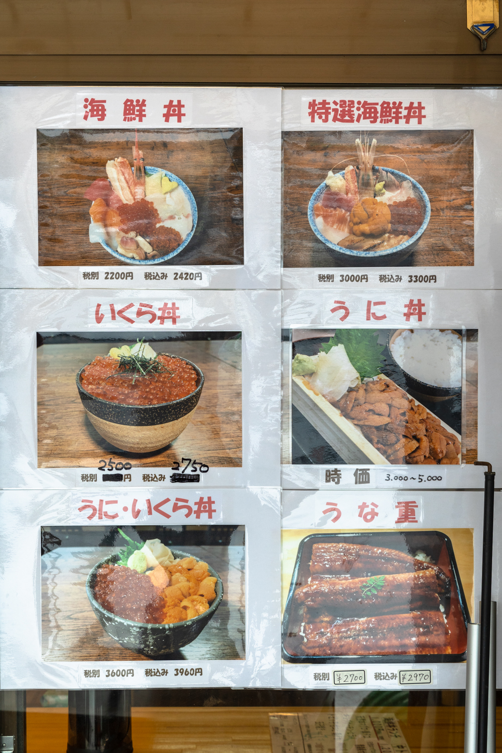 메뉴판, 특선해산물 덮밥 3,300엔 , 기본 해산물덮밥 2,420엔 , 우니 덮밥, 우나기 덮밥에 대게 반마리가 들어간 미소시루 880엔... 침샘이 폭발합니다.