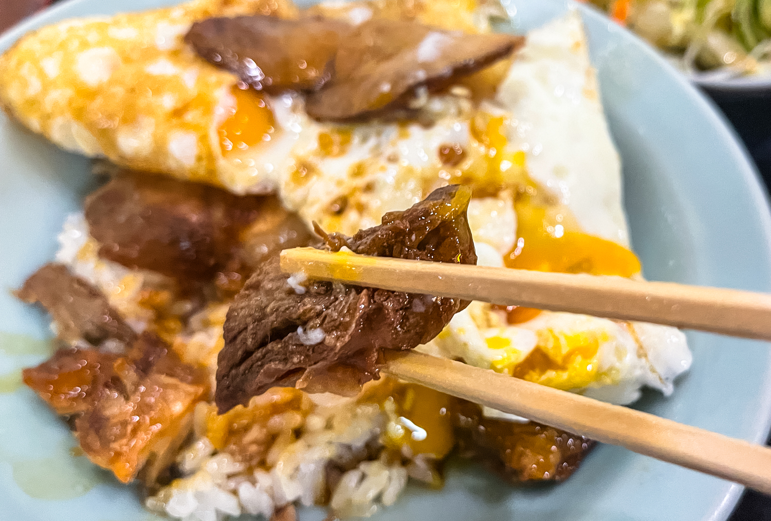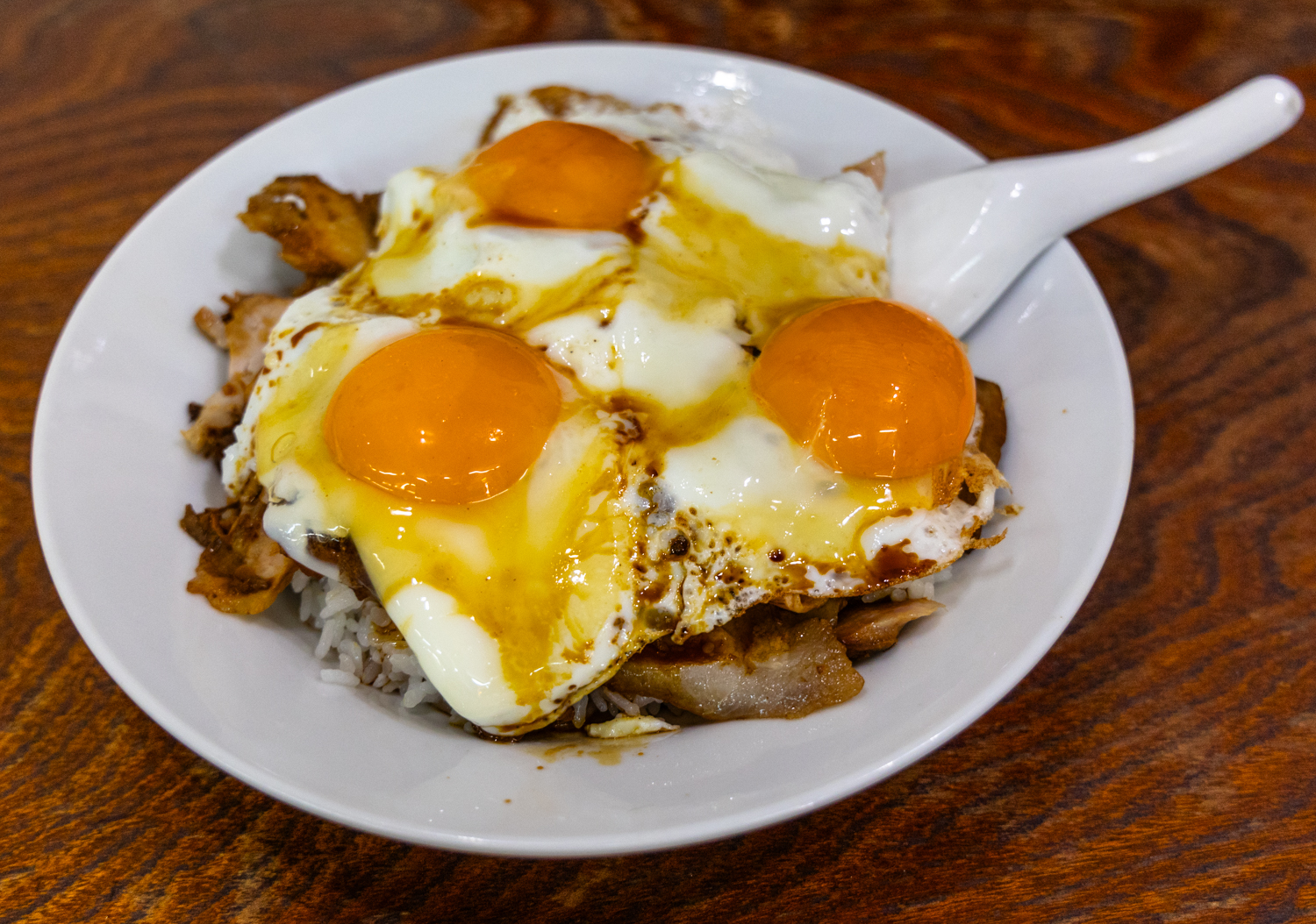 일행이 주문한 반숙 달걀 세 개가 올려진 대자입니다. 푸짐한 돼지고기와 쌀밥에 달걀 프라이를 세 개나 올렸으면 몇 칼로리나 될까요? 한 끼 정도는 안 먹어도 될 것 같은 고칼로리 덮밥입니다.