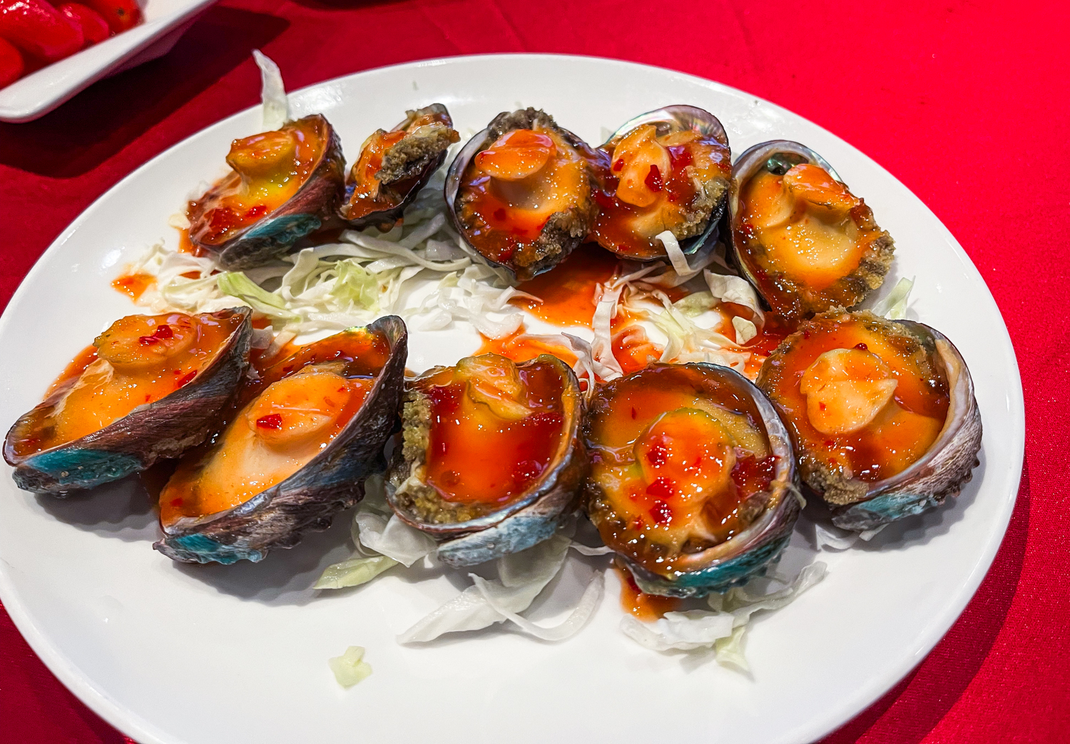 왼쪽 사진은 오리혀와 날개, 발이라고 하는데 보기에 좀 징그럽게 생겼습니다. 살보다는 양념한 맛으로 먹는 요리라고 하는데 전 손이 가지 않더군요. 오른쪽은 전복칠리소스찜인데, 꼬들꼬들한 전복살이 신선하고 맛있습니다.