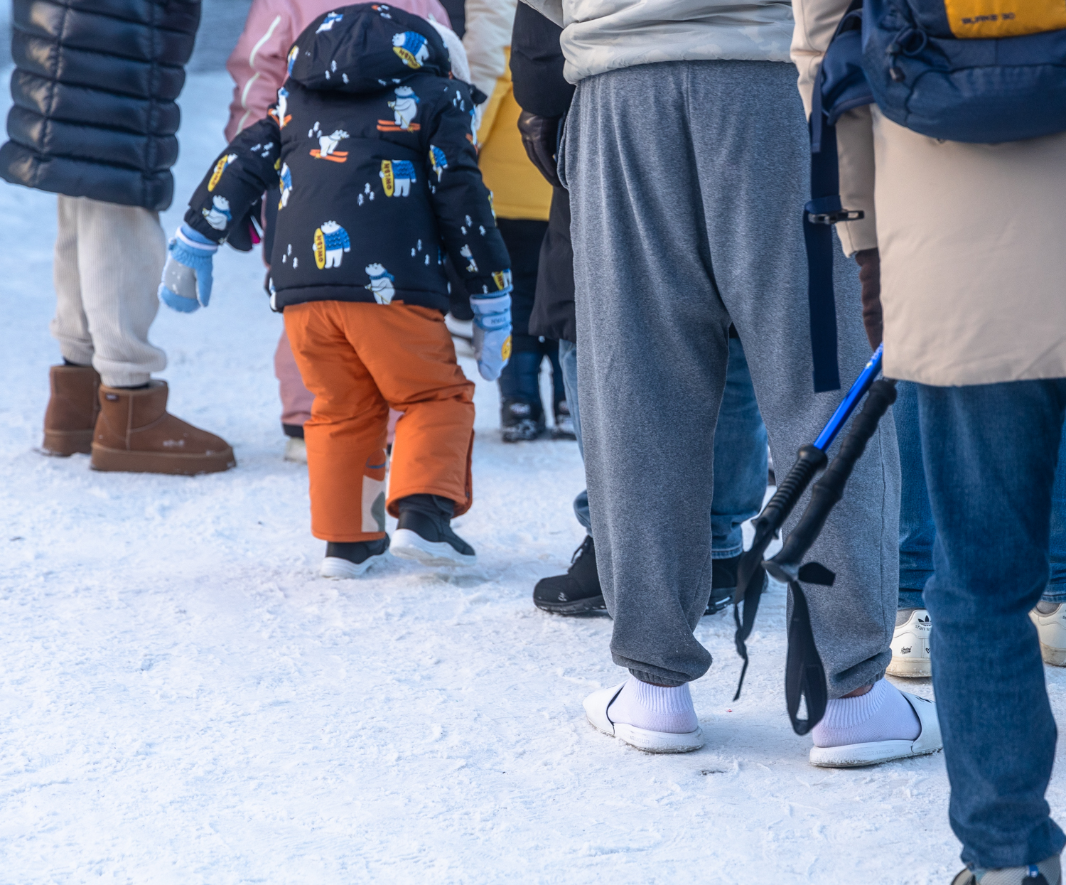 곤도라 줄에서 본 슬리퍼, 이 사람 한 시간을 저 차림으로 줄 서 있었는데 동상이라도 안 걸렸을까 모르겠습니다. 겨울 향적봉은 곤돌라로 쉽게 오를 수 있어서 만만하게 생각하는 것 같은데, 천 미터가 넘는 고산이어서 날씨가 언제 어떻게 바뀔지 모르는 위험한 산이기도 합니다. 겨울 향적봉은 방안모, 장안장갑, 패딩, 목이 긴 방안화는 필수 장비입니다.