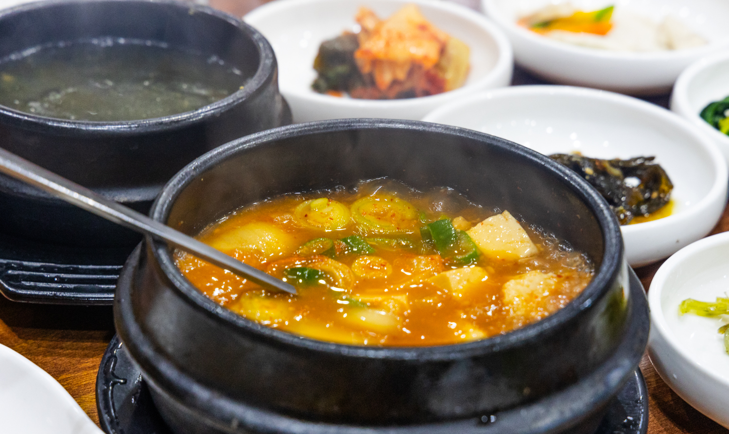 주문하고 얼마 되지 않자 반찬과 제육 고등어자반 찌개를 쫙 깔아 주십니다. 고기와 국, 김치 하나만 있어도 한 그릇 뚝딱인데 이건 뭐 넘칠 정도입니다. 다양한 나물반찬과 된장찌개까지 부모님 모시고 오면 너무 좋아하실 것 같은 차림입니다.