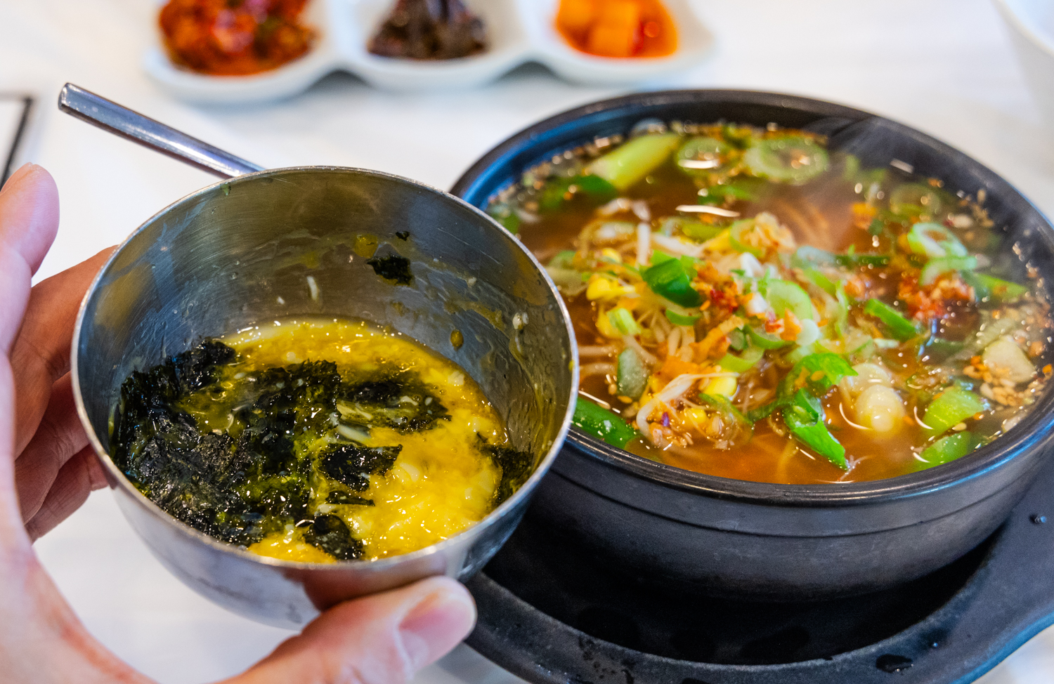 수란 공기에 콩나물국 육수를 몇 숟각 넣은 다음 김가루를 넣어서 에피타이즈로 먹습니다. 위벽이 든든하게 코팅되는 느낌입니다.