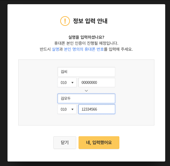 네 번째, 정보 입력 안내 박스가 나오면 아래 네, 입력했어요 노란 박스 클릭