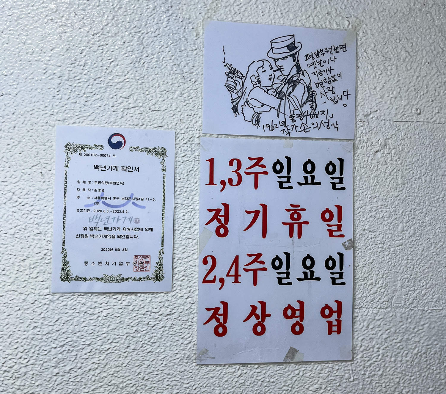 부원면옥에 붙어 있는 백년가게 인증서는 30년 이상 명맥을 유지하면서 고객의 사랑을 받고 있는 제조업을 제외한 소상인 및 소·중기업에게 수여하는 인증 이라고 합니다. 부원면옥은 1960년에 문을 열었으니 벌써 64년째 영업을 하고 있는 노포 중의 노포입니다.
