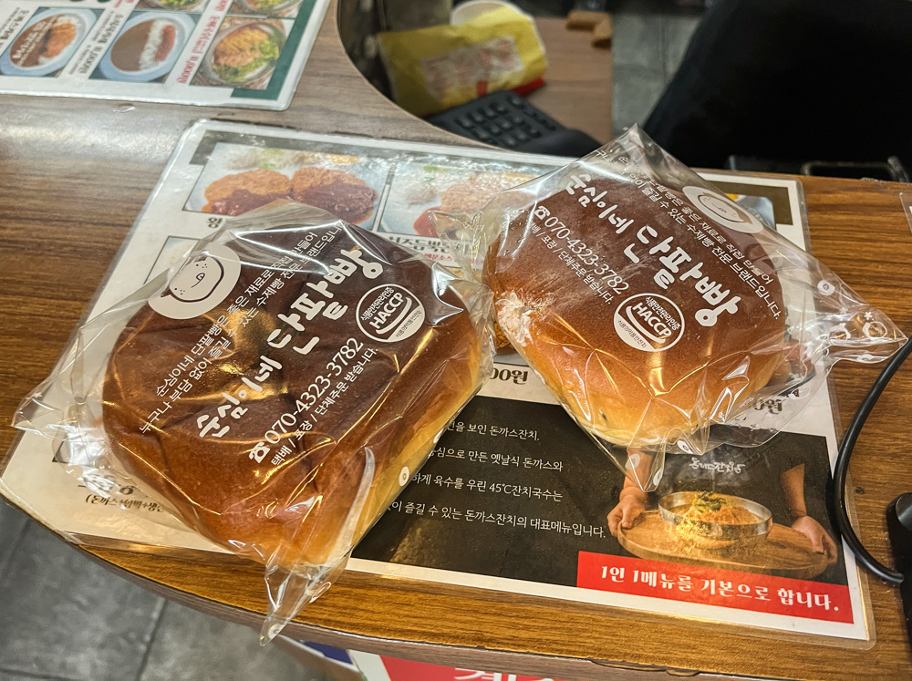 돈까스잔치네는 순심이네 단팥빵이라는 단팥빵도 함께 판매하고 있습니다. 단팥빵은 그냥 지나갈 수 없죠, 가격이 좀 비싸긴 해도 단팥빵 1개와 크림단팥빵 1개 구입합니다.