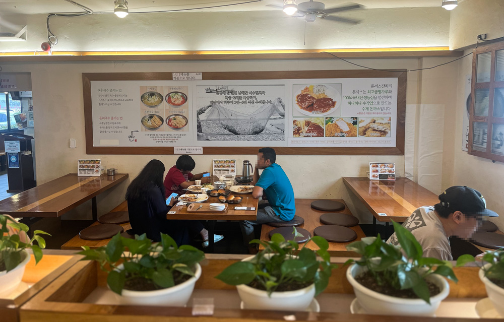 돈까스잔치가 유명하게 된 게 잔치국수 위에 돈까스가 토핑으로 올라간 돈잔국수 때문이라고 합니다. 저는 처음 방문했을 때 비빔국수에 돈까스가 올라간 '돈비국수'를 먹었는데 이번에는 왕돈까스를 주문했습니다. 아이는 돈까스모밀을 먹겠다고 하고 아내는 돈비국수를 추천했습니다.